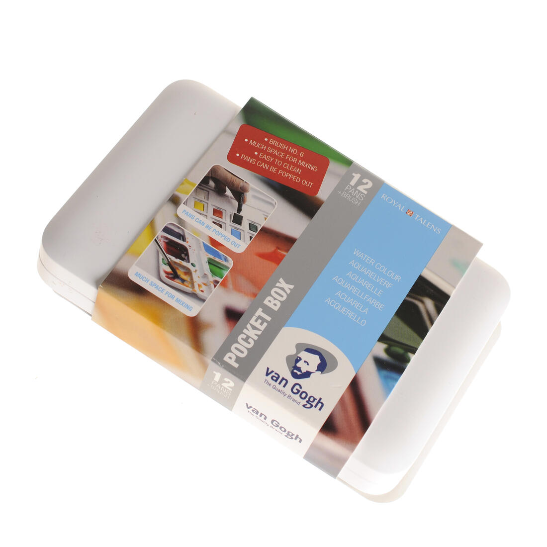 Van Gogh aquarelverf, pocket box met 12 halve napjes Lichtechte kleuren: zelfs wanneer de verf met veel water verdund wordt, blijft de verf sprankelend lichtecht. Veilig: alle pigmenten zijn vrij van schadelijke metalen. Compacte witte kunststof doos met afgeronde hoeken. 12 halve napjes met penseel nr. 6.