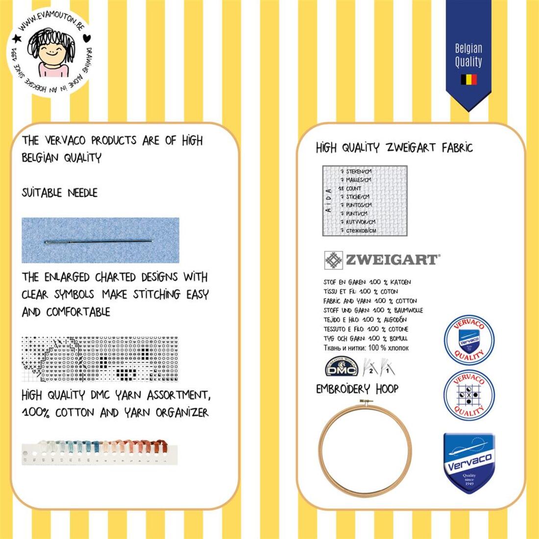 - Garen: 100% katoen DMC, Aida 7 steken/cm