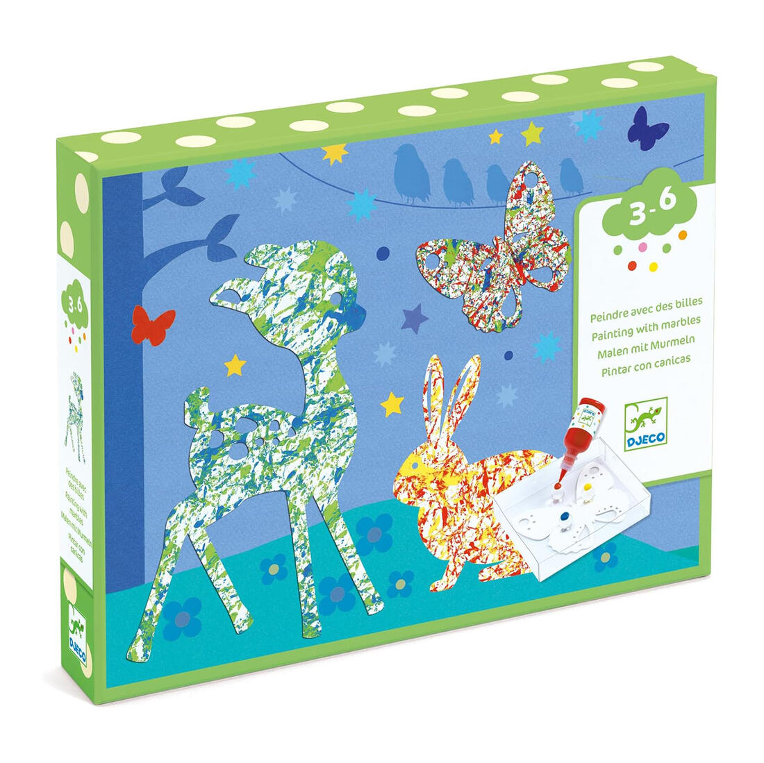 Het is leuk om de doos krachtig te schudden en te zien hoe de verf sporen op de vormen maakt! Een originele activiteit: schilderen met knikkers. Knoeivrije verf: de verf zit opgesloten in de doos. 3 x 8 modellen, om de kleuren te variëren. Een instructieboekje in kleur met plaatjes. Gemaakt van FSC®-gecertificeerd papier en karton.