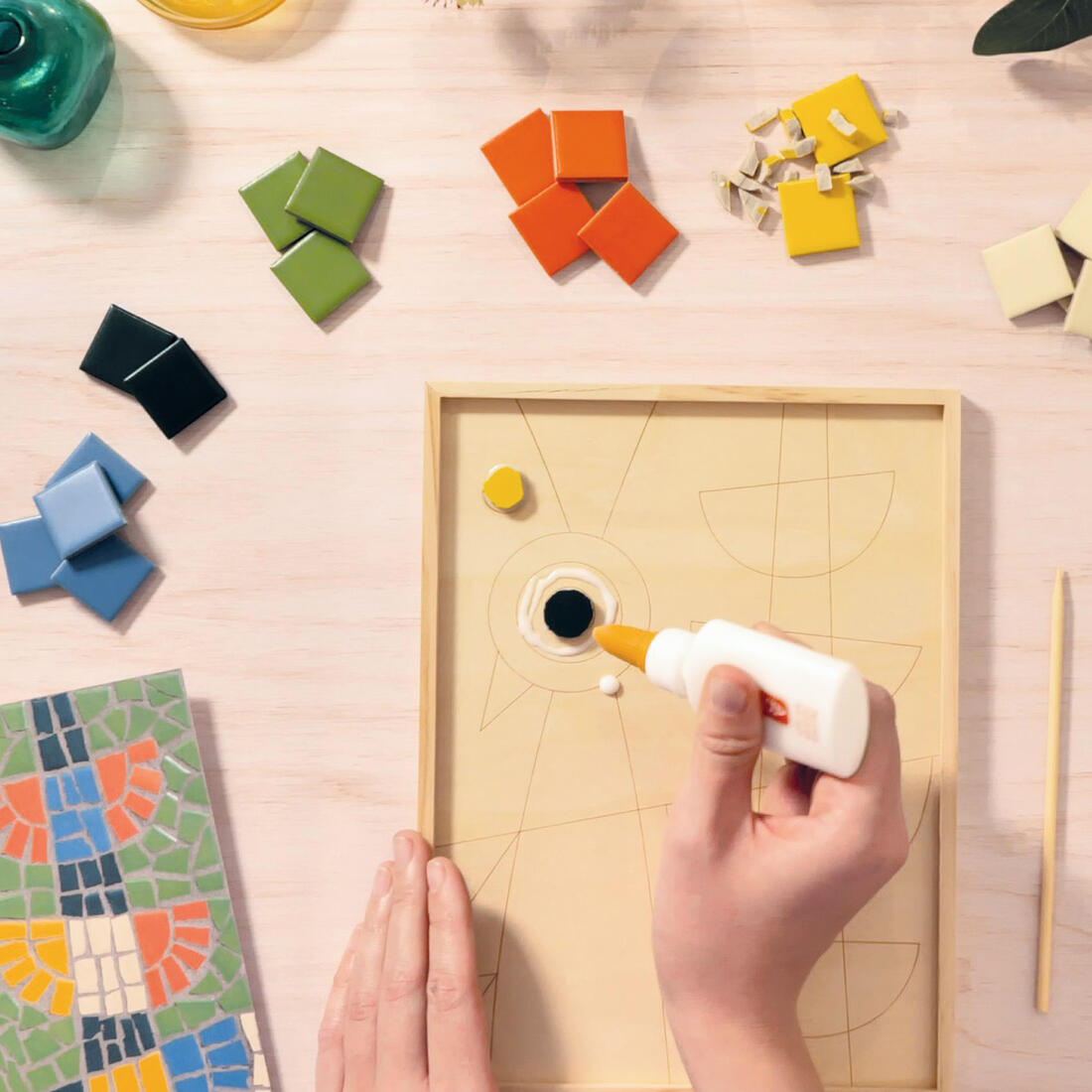 Met een mozaïektang leer je kleine keramische mozaïeksteentjes te breken en samen te voegen, zodat jouw motief vorm krijgt op een bedrukte houten plaat. Lijm, cement, professionele gereedschappen: alles wordt meegeleverd om je te helpen bij deze creatieve ervaring.