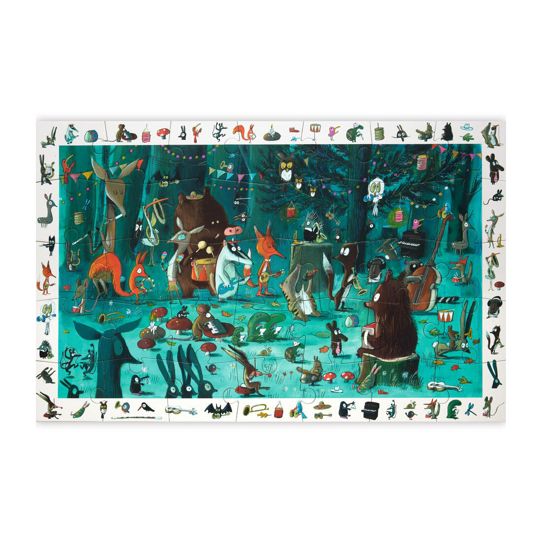 Een observatiepuzzel van 35 stukjes die een bos voorstelt waarin dieren muziek spelen. Wie speelt gitaar? Wie speelt op de trommel? Kindjes maken eerst de puzzel en zoeken vervolgens met plezier de elementen uit de kader in de afbeelding. Voor puzzelaars vanaf 3 jaar. De afmetingen van de puzzel zijn 61 x 38 cm.