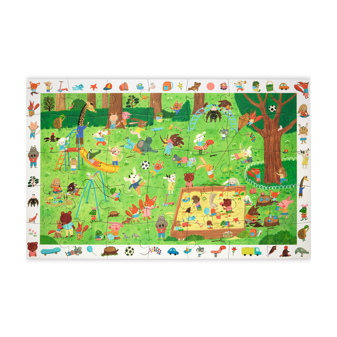 Een observatiepuzzel van 35 stukjes om kleine dierenvriendjes te ontdekken die plezier hebben tijdens een middag op het speelplein. Het kind maakt eerst de puzzel van de speeltuin en zoekt vervolgens elementen uit de kader in de prent. Wie speelt met het blauwe autootje? Wie is aan het vliegeren?