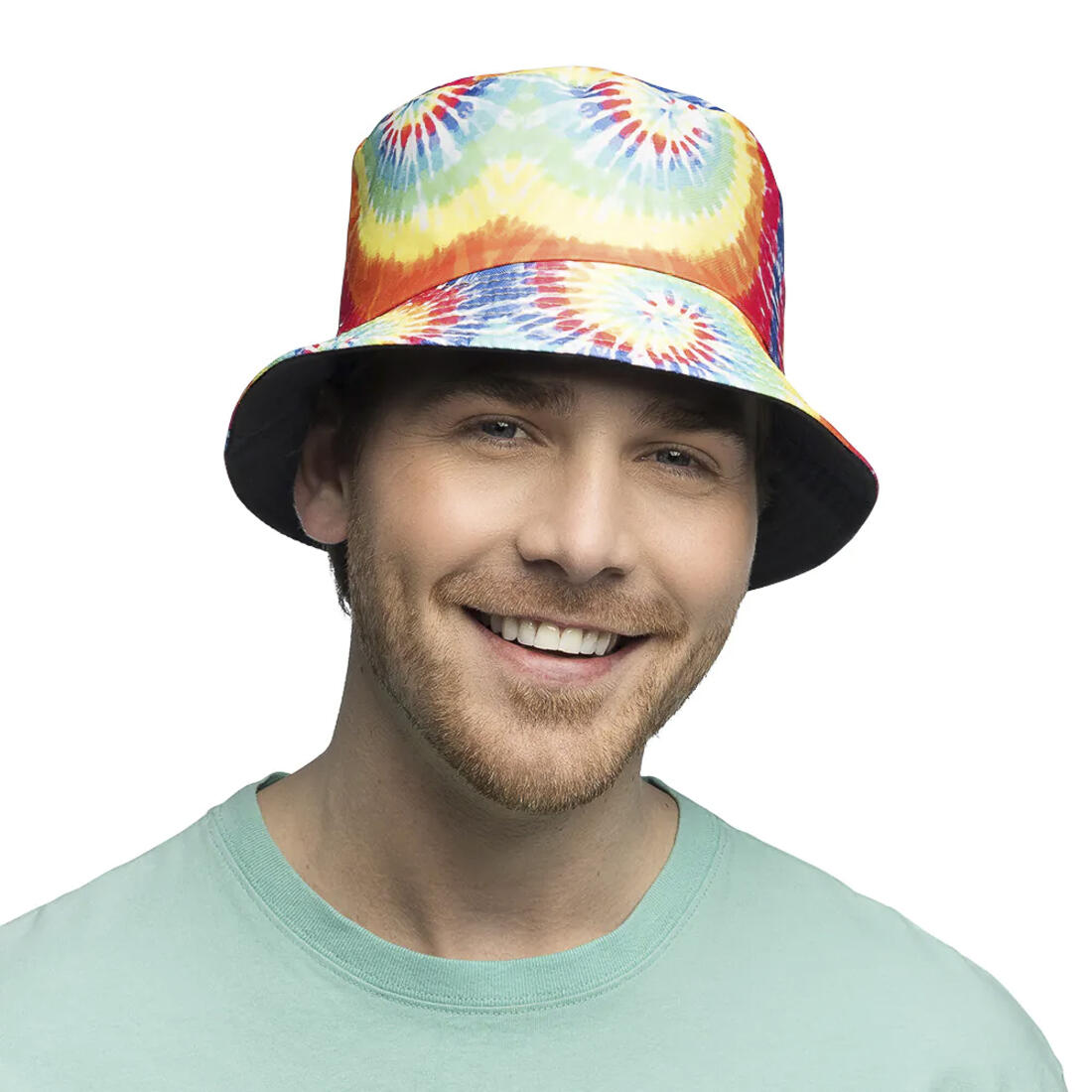 Festivalhoedje in vrolijke kleuren en psychedelische figuren.