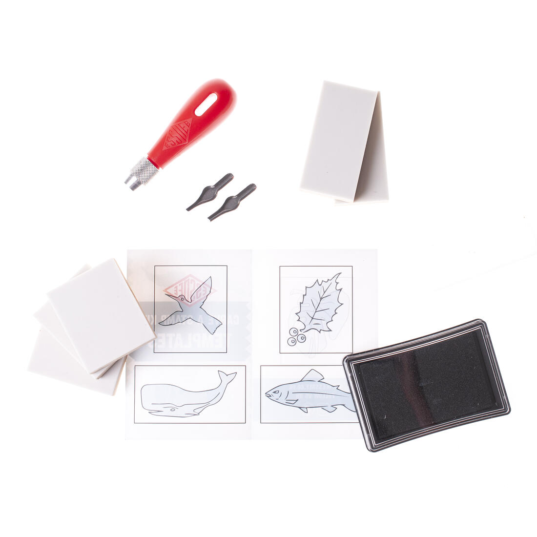 Ontdek de MasterCut Stempelset, een complete en stijlvolle set om je eigen stempels te snijden en af te drukken. Alles wat je nodig hebt, is netjes verpakt in een mooie kraft-kartonnen doos. Deze set is ideaal voor beginners en creatievelingen die graag hun eigen stempels willen maken en gebruiken.