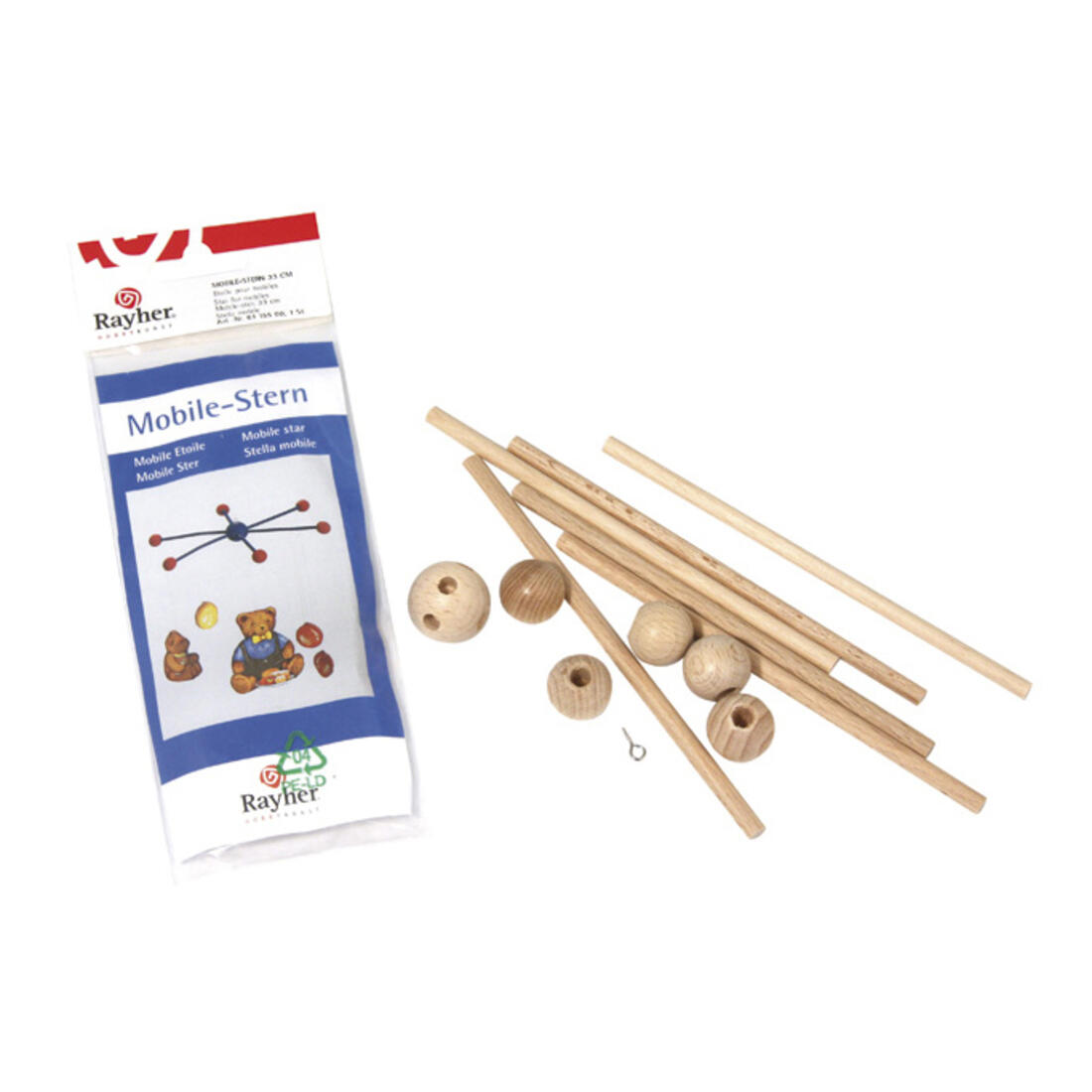De kit voor een mobiele ster bevat: 6 houten stokjes Ø 4 mm en 10 cm lang, 6 ballen als eindstukken, 1 middelste bal, 1 kleine ringhaakschroef en instructies. De afgewerkte ster heeft een diameter van 33 cm. U kunt de ster schilderen zoals u wilt en hangers maken van papier, karton, foto's, stof, hout enz. naar uw wensen. Deze kan je nadien met koorden of linten aan de ster bevestigen.