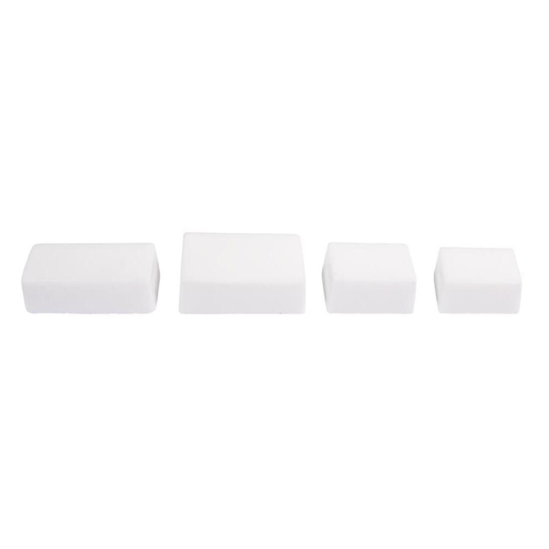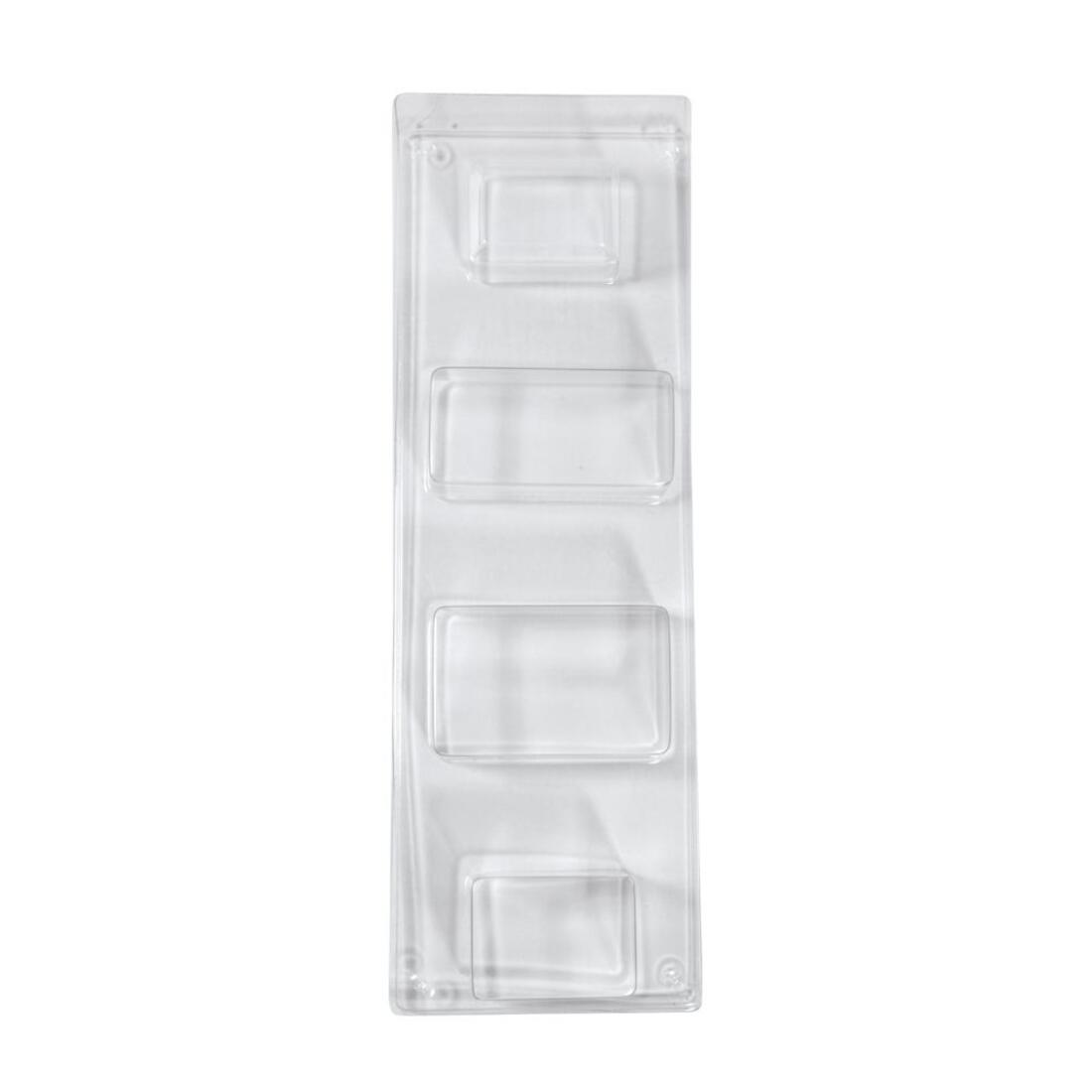 Je krijgt vier zeepvormen in één in de afmetingen van: 85 x 40 mm voor 97 g zeep, 55 x 40 mm voor 72 g zeep, 80 x 50 mm voor 123 g zeep en 50 x 35 mm voor 68 g zeep, en telkens een diepte van 3cm.