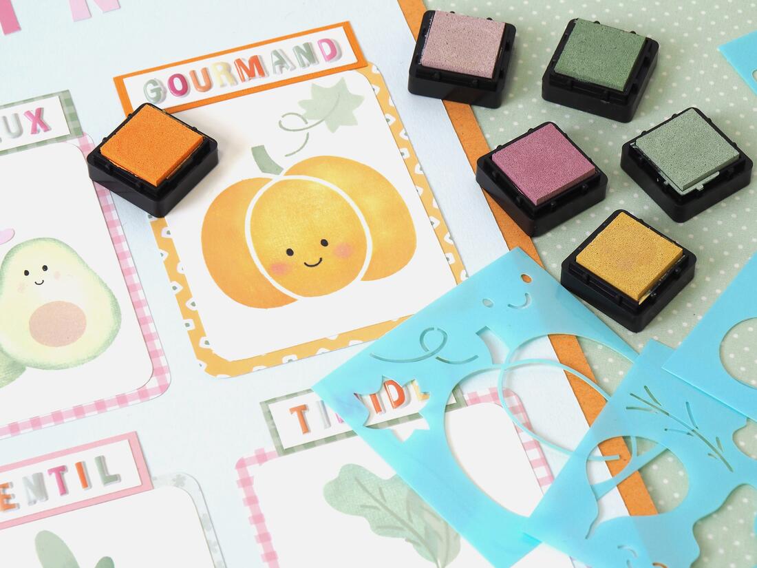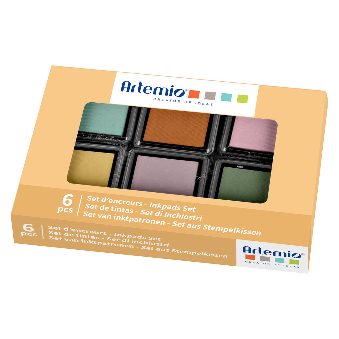 Stempelkussens in 6 kleuren: geel, lichtroze, donkerroze, oranje, lichtgroen, muntgroen