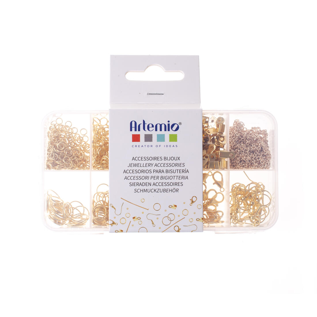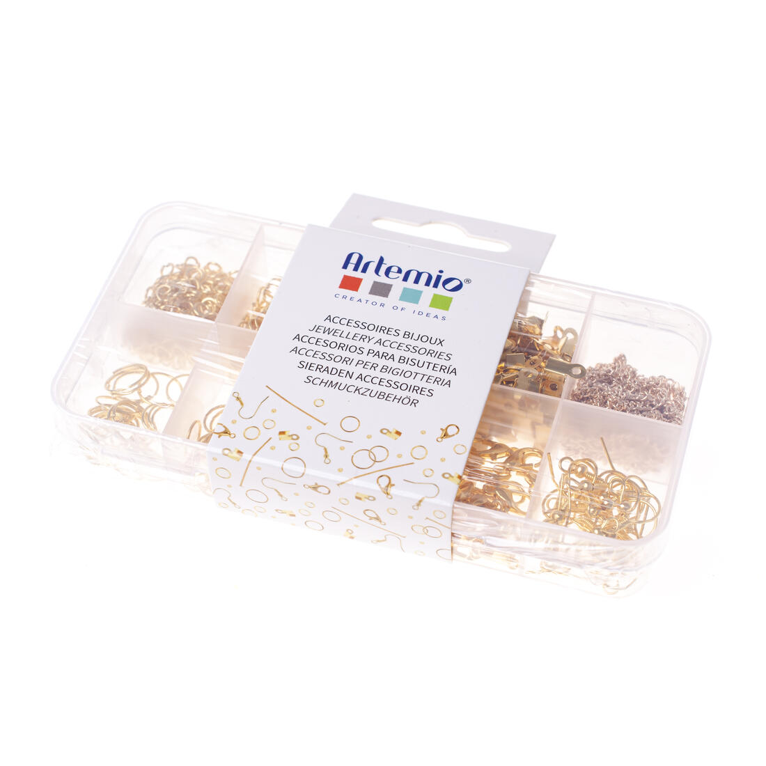 Deze Artemio sieradenaccessoires-set is een veelzijdige en complete oplossing voor iedereen die graag juwelen maakt of herstelt. De set bevat een selectie van goudkleurige metalen onderdelen, netjes gesorteerd in een transparante opbergdoos met meerdere compartimenten. Elk onderdeel is ontworpen voor specifieke toepassingen in sieradencreatie, zoals het bevestigen, verbinden of afwerken van kettingen, armbanden en oorbellen.