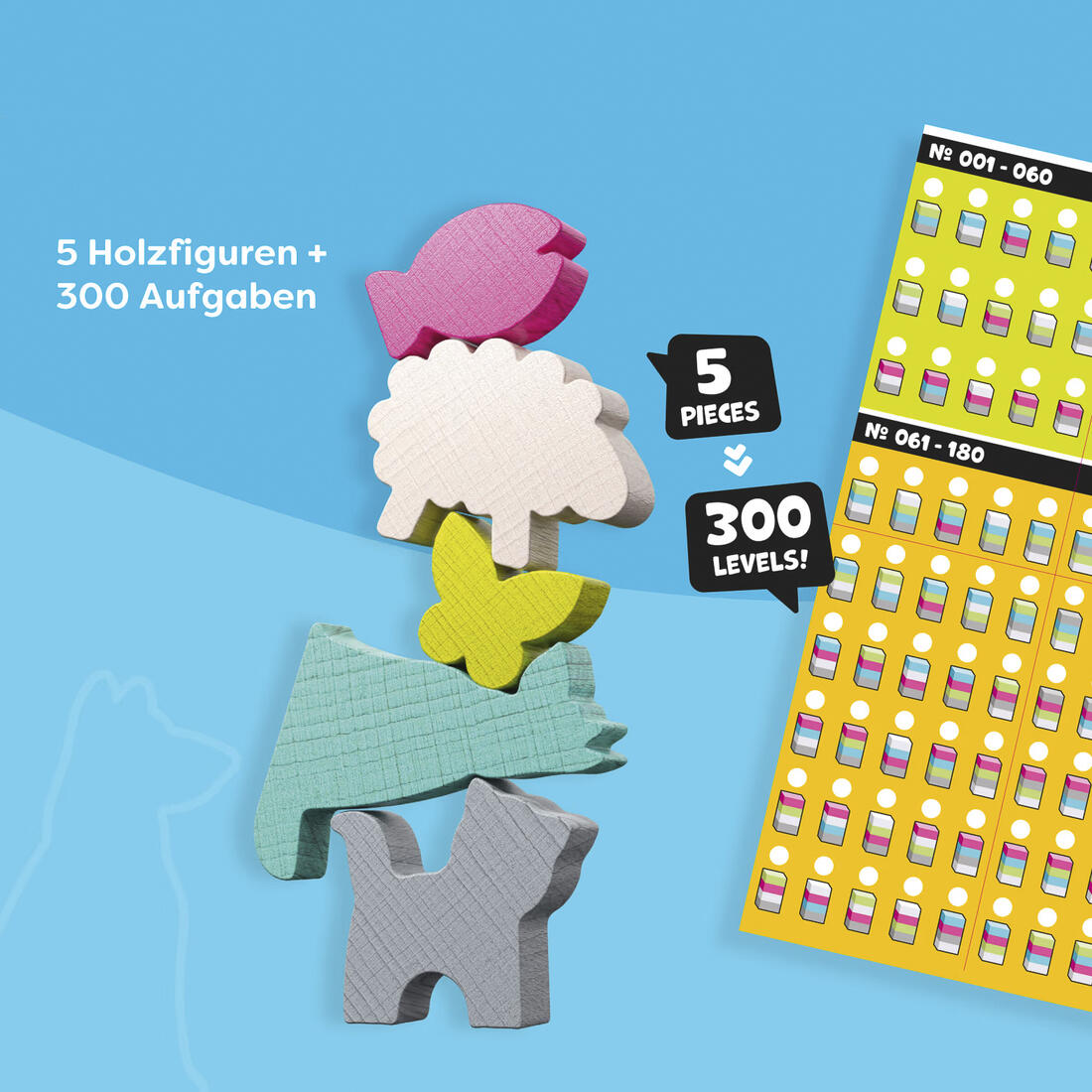 Een wiebelige uitdaging die om een vaste hand en precisie vraagt! Stapel tot vijf houten blokjes in de juiste volgorde. Met 300 opdrachten van makkelijk tot moeilijk.