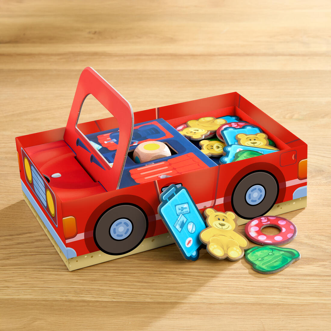 Winnie, de wasbeer, gaat op reis. Nu alleen nog snel zijn bagage in de rode bolide leggen! Wie als eerste, en met een beetje geluk met de dobbelsteen, zijn/haar bagage in de auto heeft geladen, wint.