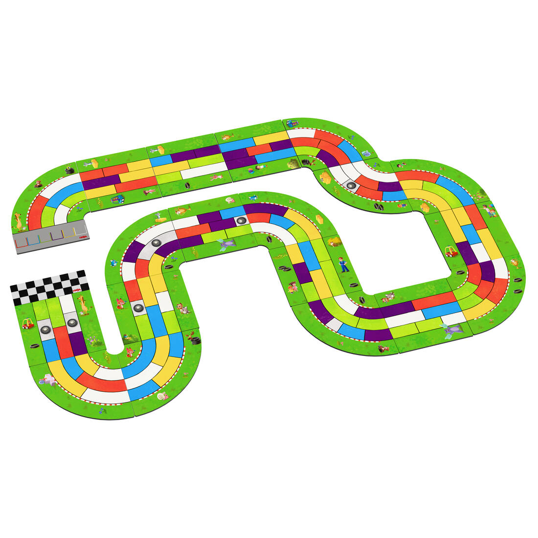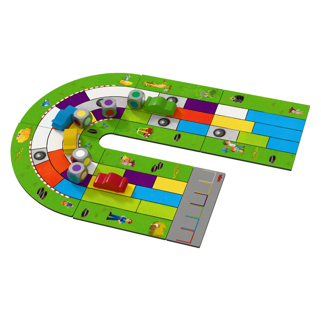Met een variabele racebaan en 6 sportieve houten racewagens.