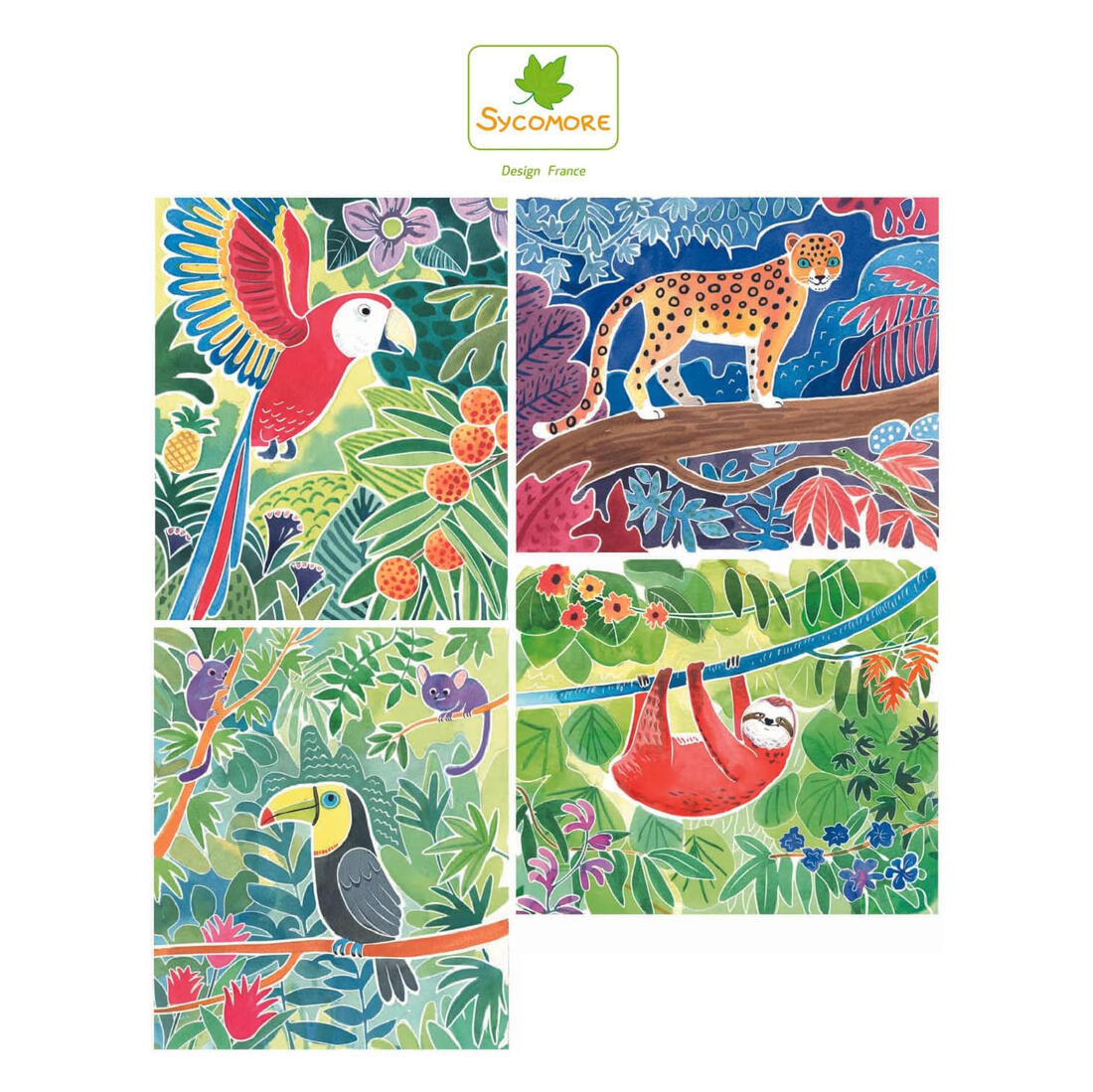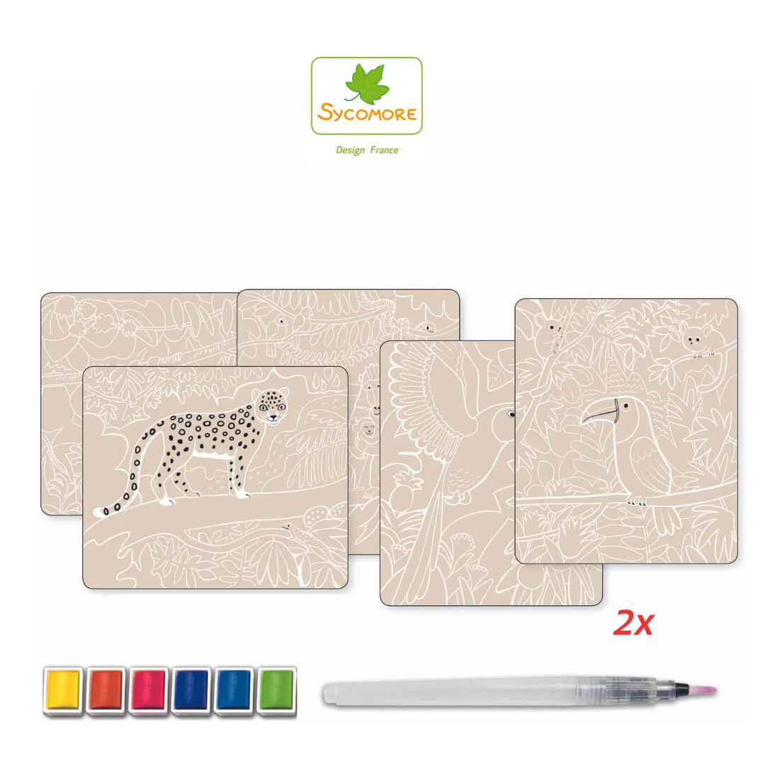 Leer de basisbeginselen van aquarel, met 5 voorgedrukte tekeningen in oerwoud thema.