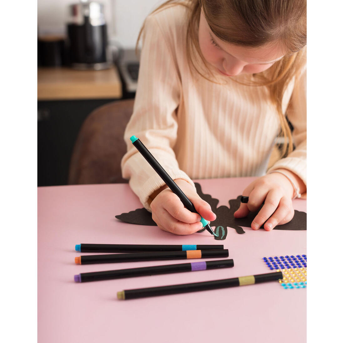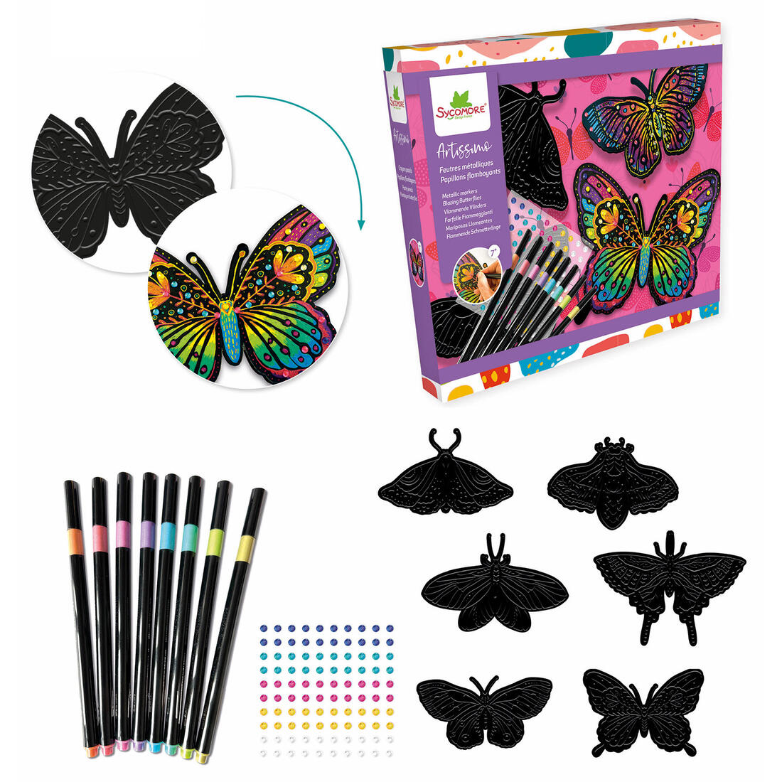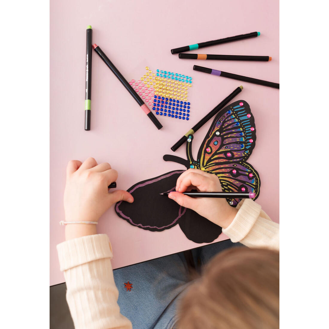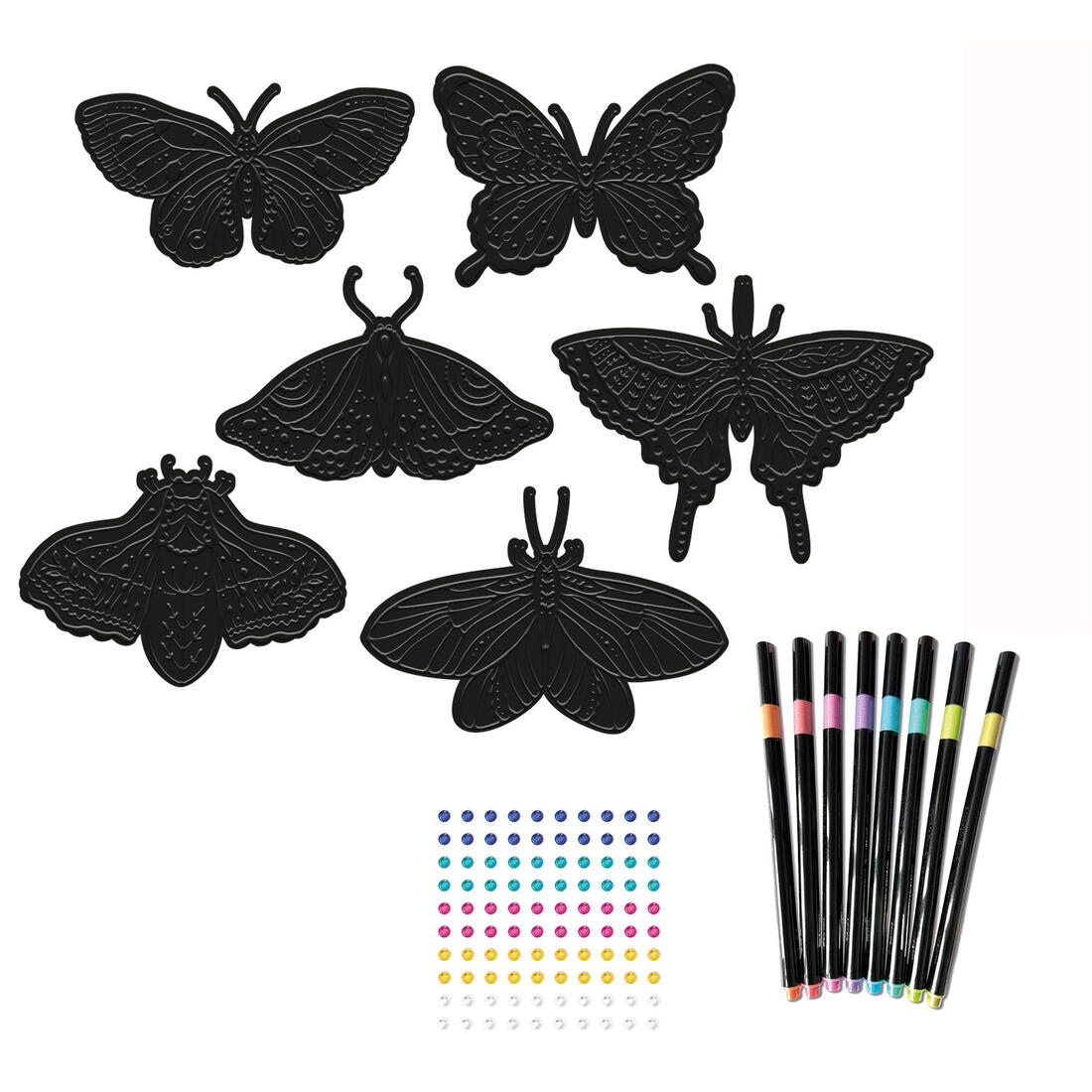 6 vlindervormige reliëfborden om in te kleuren met 8 DELUXE ZWARTE metallic stiften. De metallic stiften hebben felle kleuren en een penseelpunt. Je kunt de vlinders verder versieren met edelstenen voor een nog sprankelender effect. Inhoud: 10 zwarte reliëfpapiertjes, 12 felgekleurde metallic stiften en 1 boekje met sjablonen en instructies.