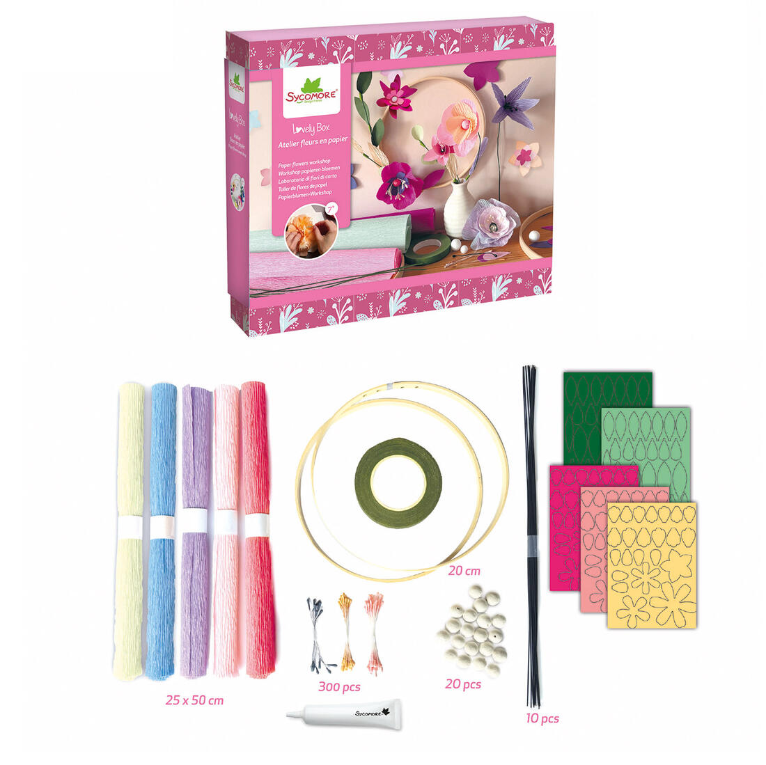 Ontdek de kunst van papieren bloemen maken en leer hoer je meer dan twintig prachtige bloemen variaties kan maken. Met al het materiaal inbegrepen in de set kan je 2 bloemenkronen, een boeket en een bloemenslinger maken.