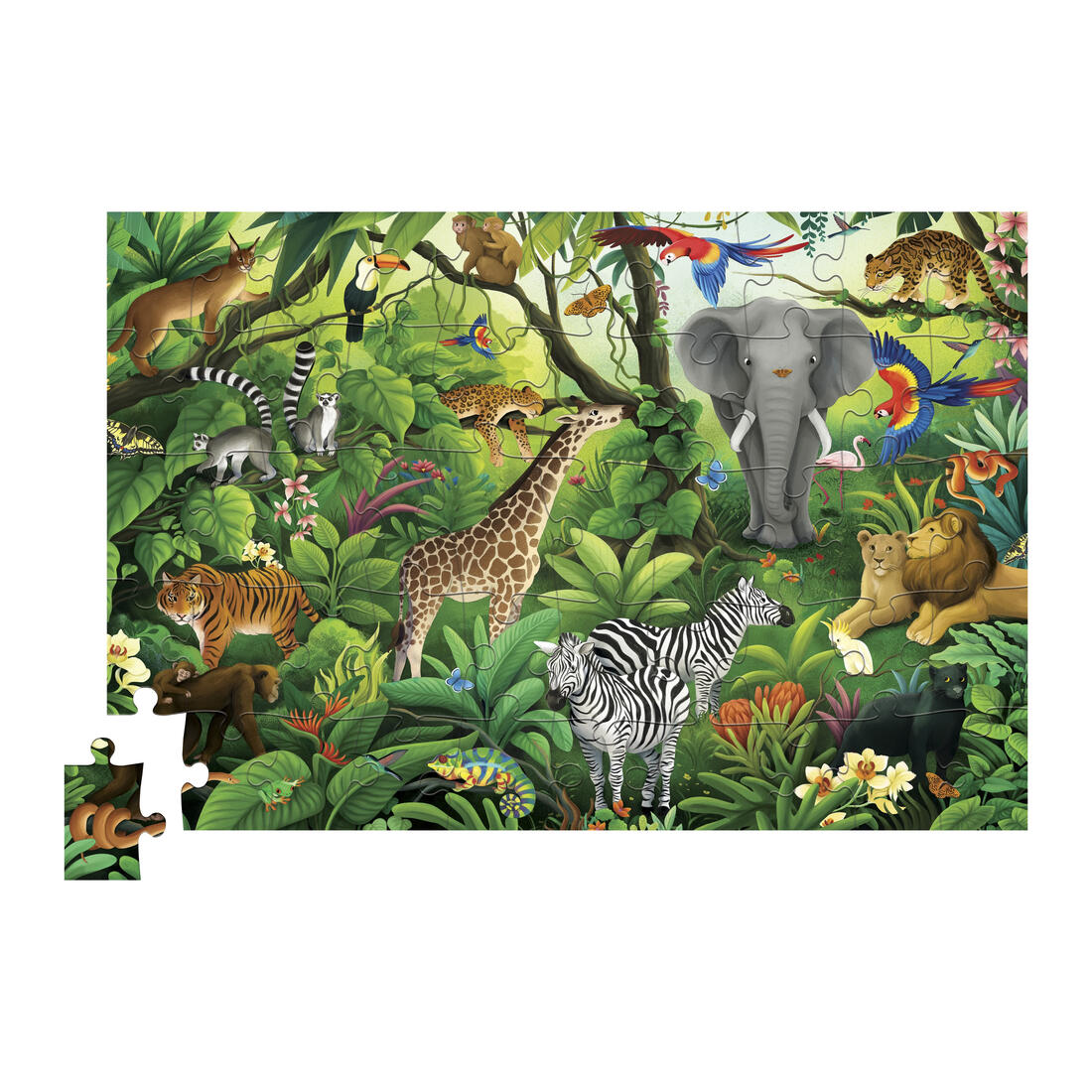 Sprankelende, holografische puzzel voor de kleinsten. Deze legpuzzel voor jonge kinderen heeft als thema dieren in de jungle.