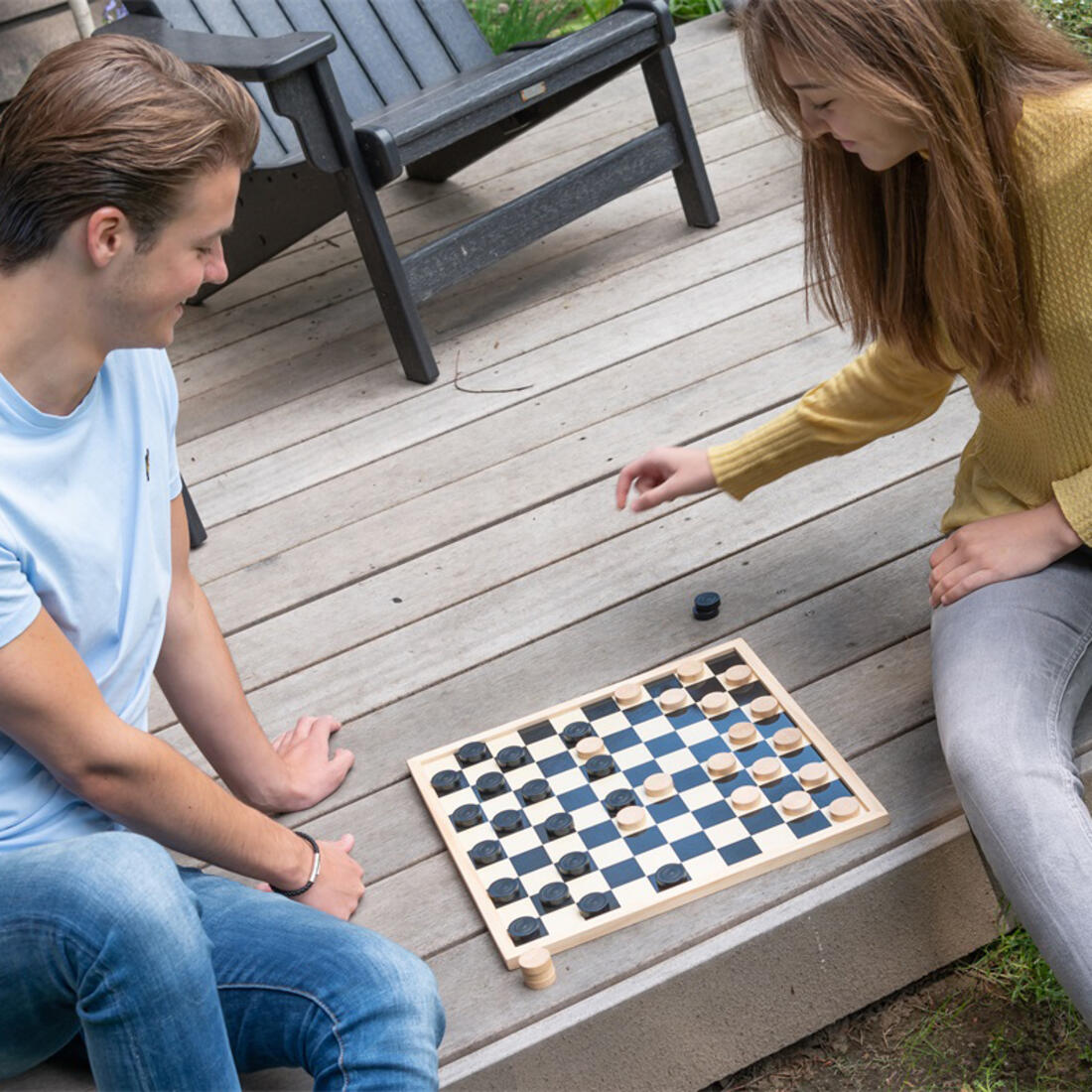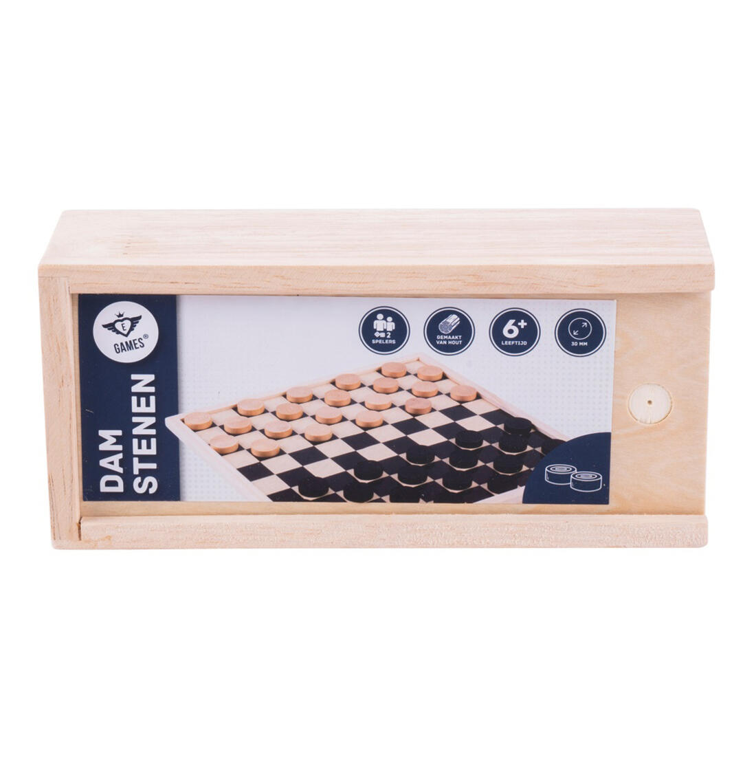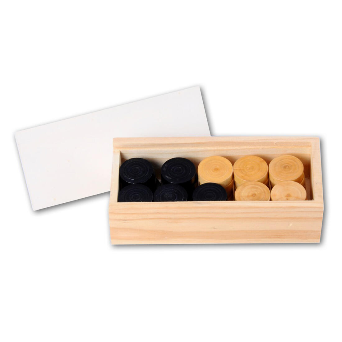 Essenhouten damstenen in een kistje. De stenen hebben een diameter van 32 mm.