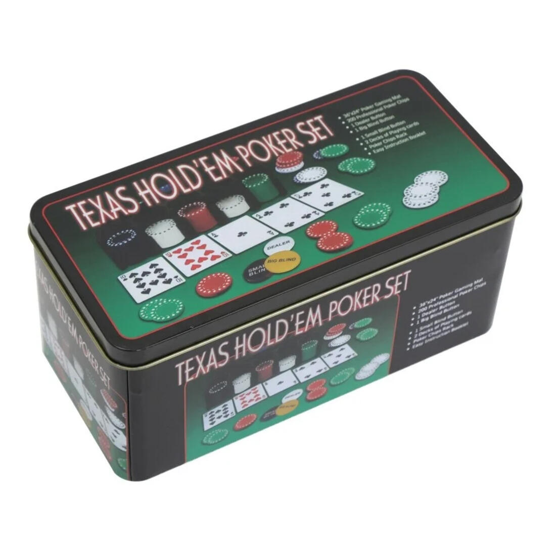 Volledige speelset voor Texas Hold'em: 2 boeken pokerkaarten, een groen speelkleed, 200 fiches van 4 gram, een dealer button, een small blind button, een big blind button en spelregels. De set wordt geleverd in een blikken doos.