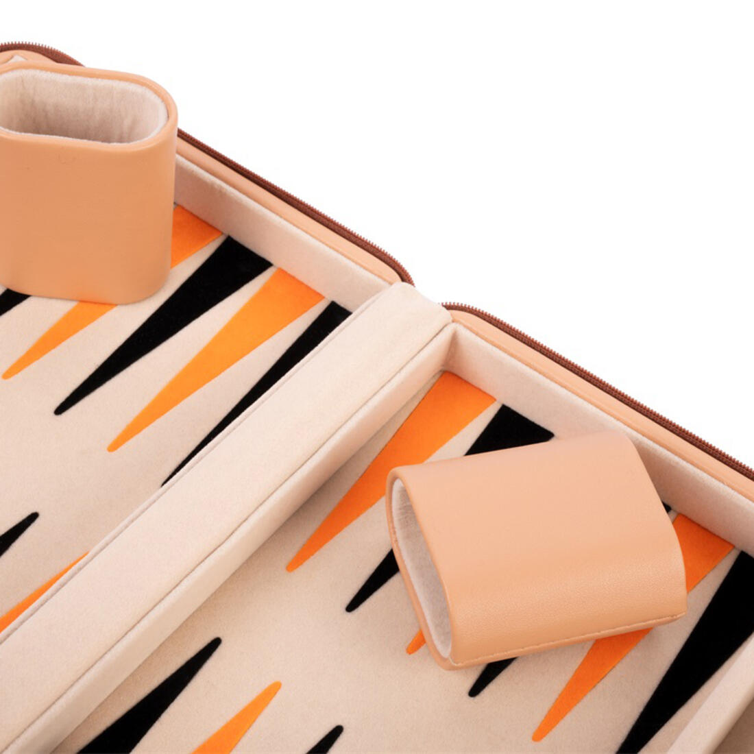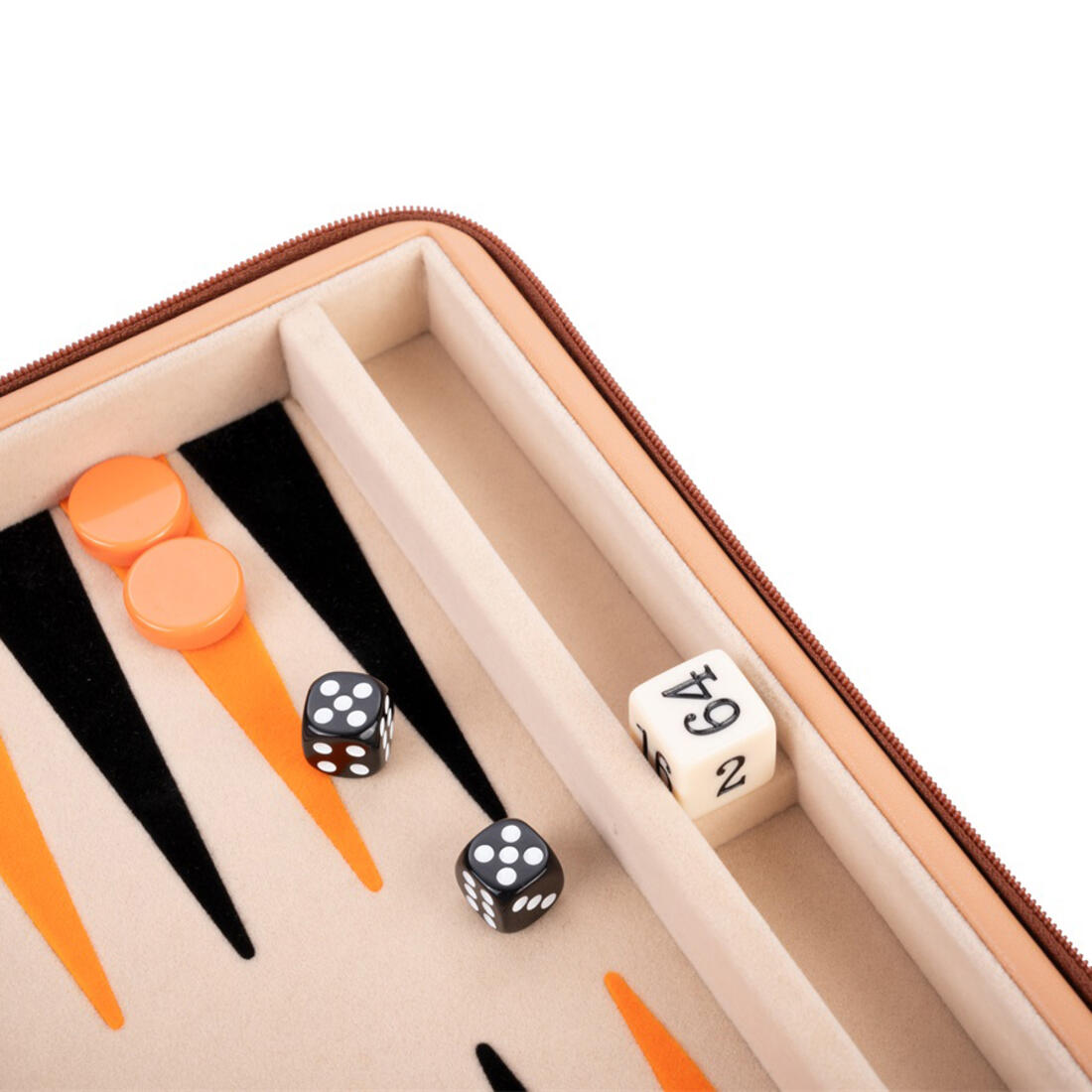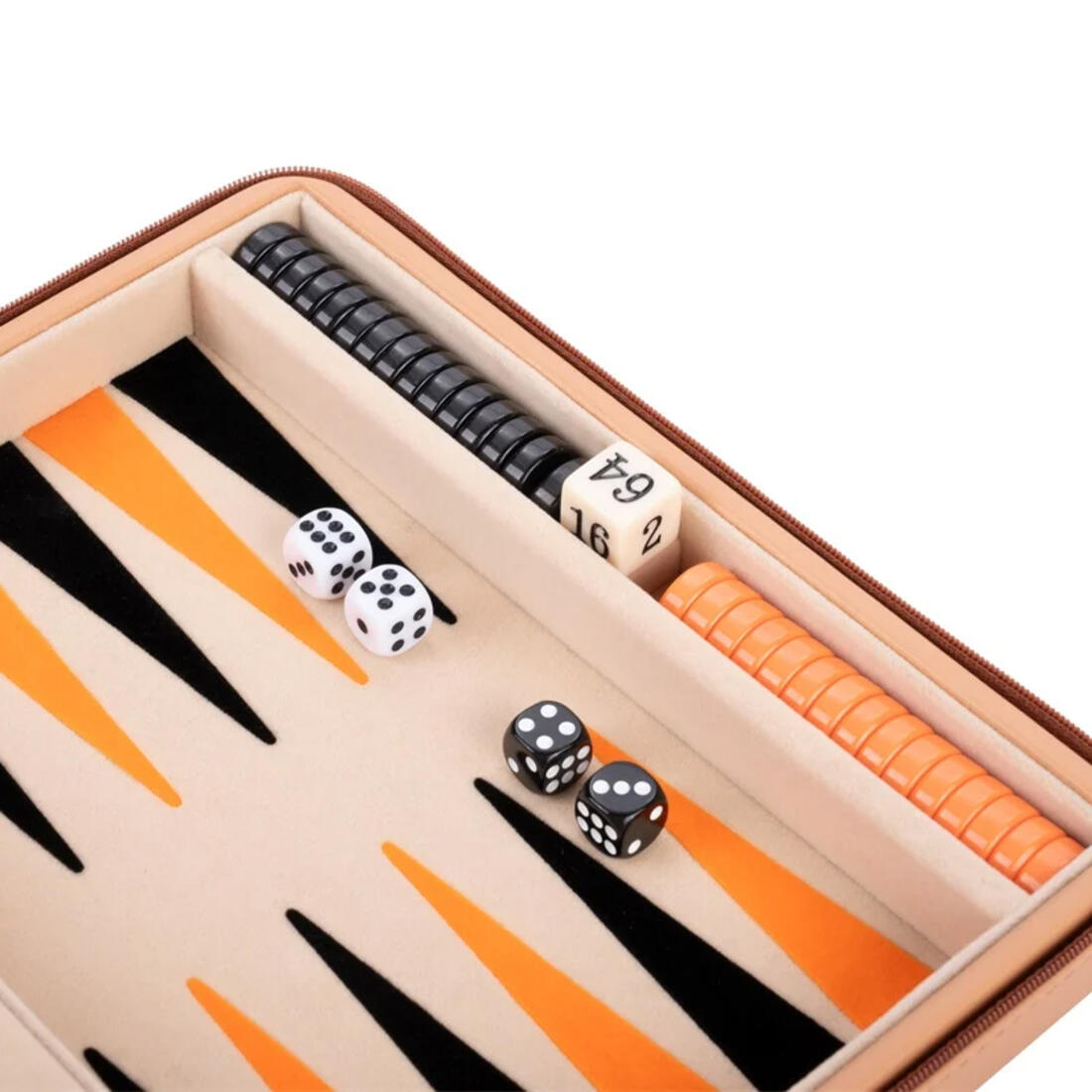 Mooie reisset. Een backgammon met 5 dobbelstenen (2 wit, 2 zwart & 1 groot) en 2 dobbelbekers in een etui met rits.