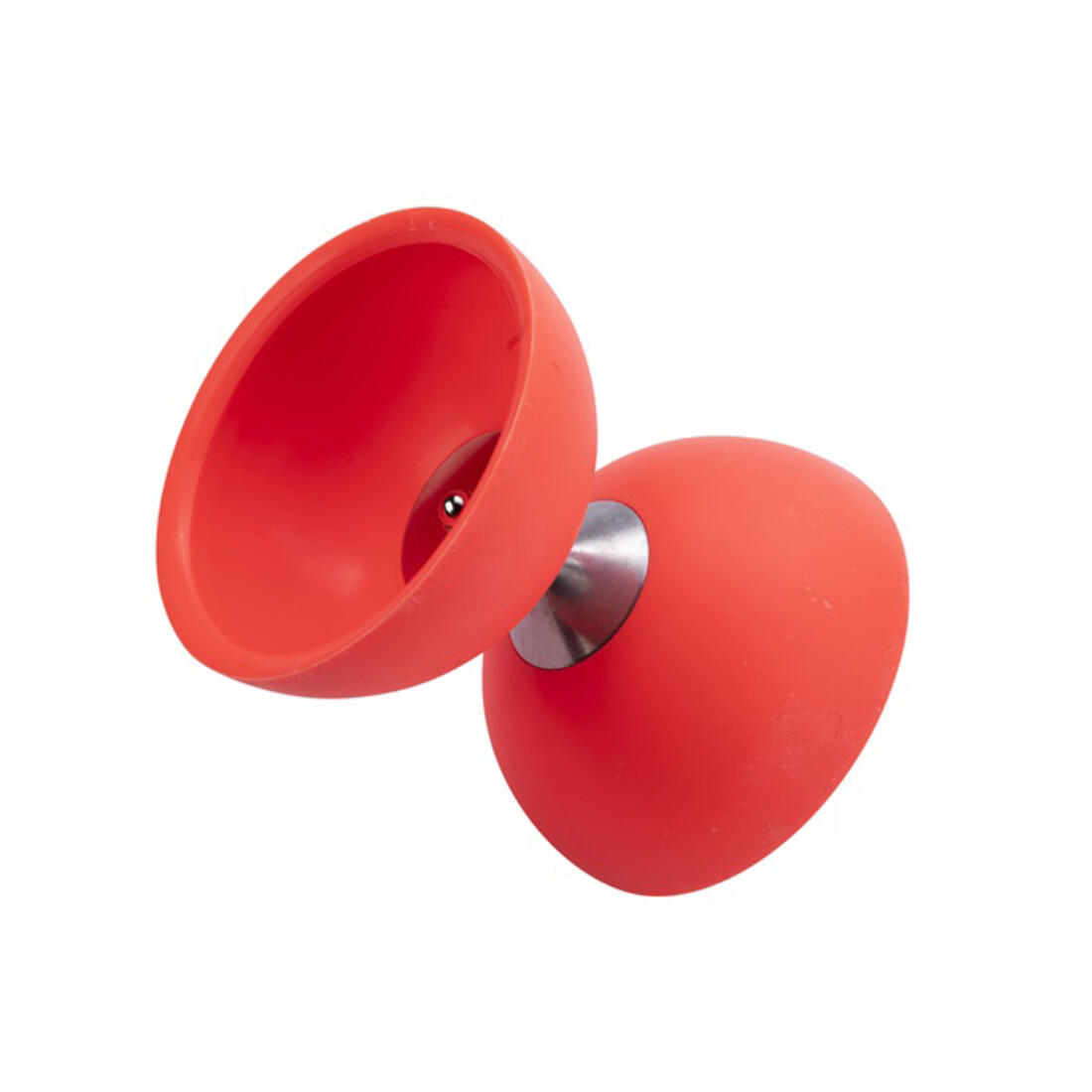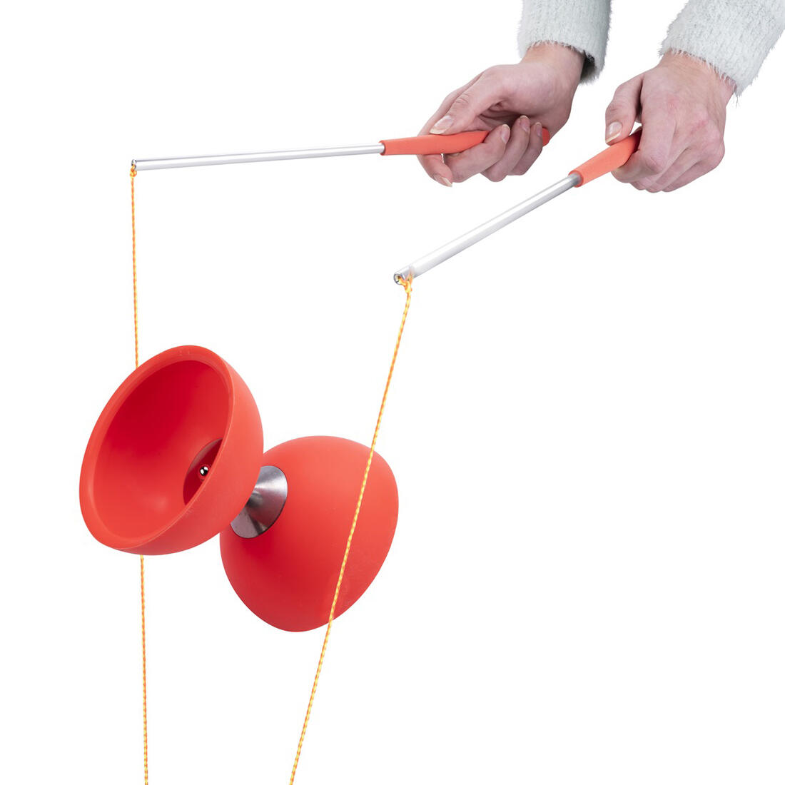 Een instapset met een handige rubberen diabolo van 10,5 cm in fluooranje en aluminium diabolostokken van 32,5 cm.