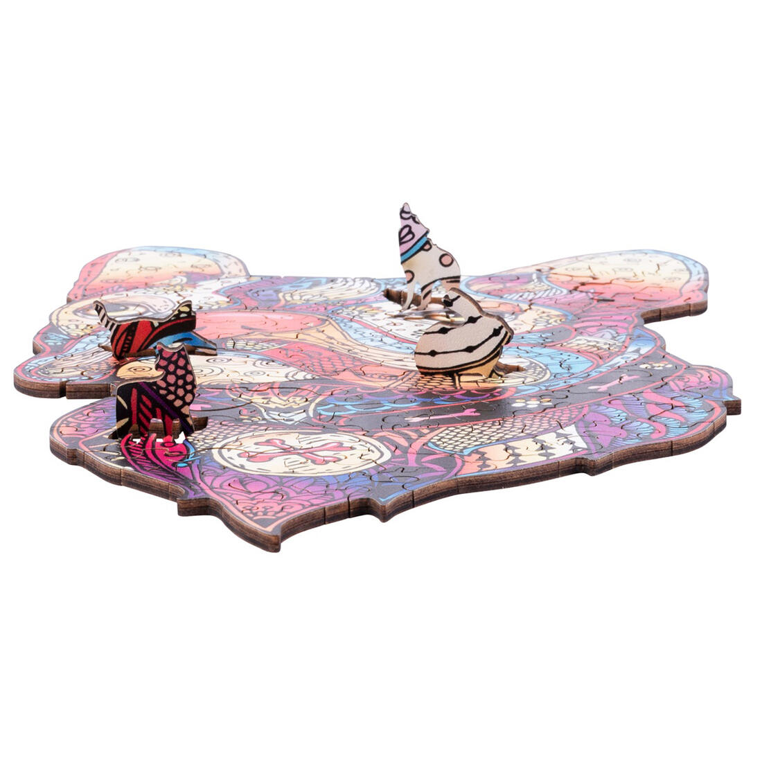 Inhoud: 213 uniek gevormde puzzelstukjes met een opbergzakje en versierde, houten opbergdoos.