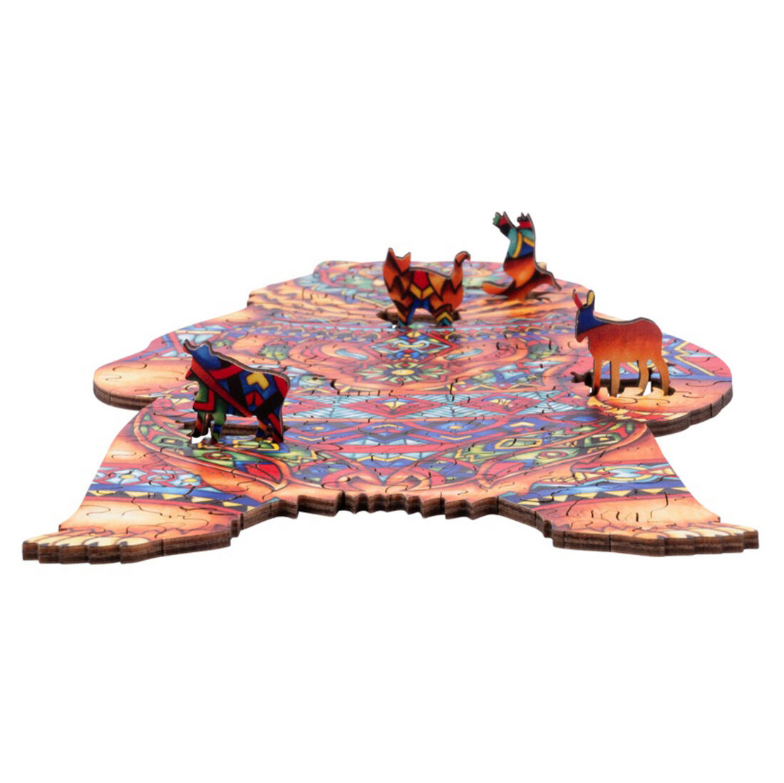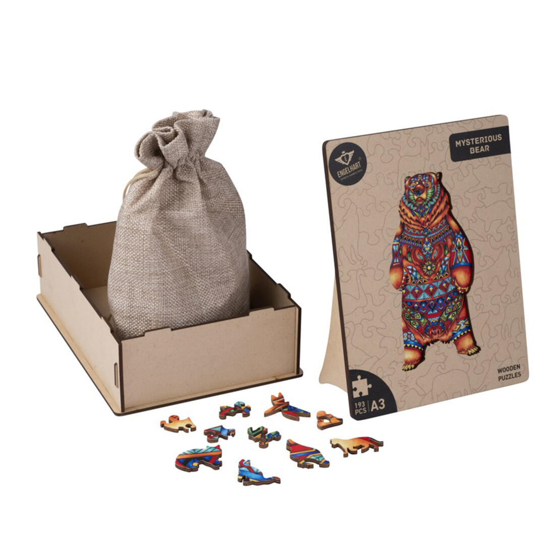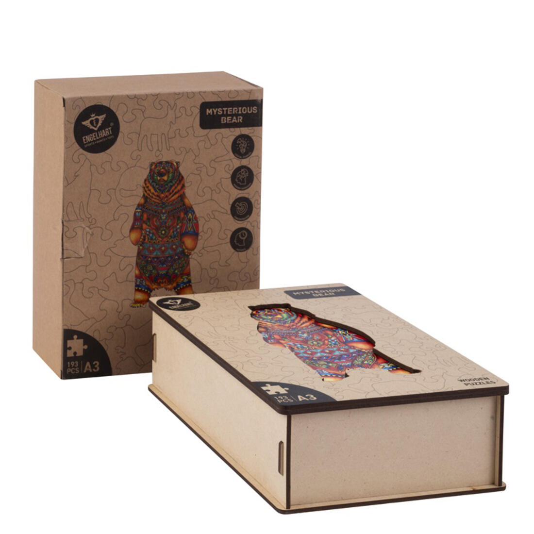 Inhoud: 193 uniek gevormde puzzelstukjes met een opbergzakje en versierde, houten opbergdoos.