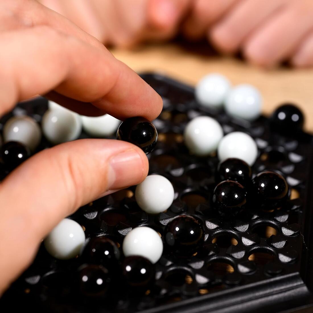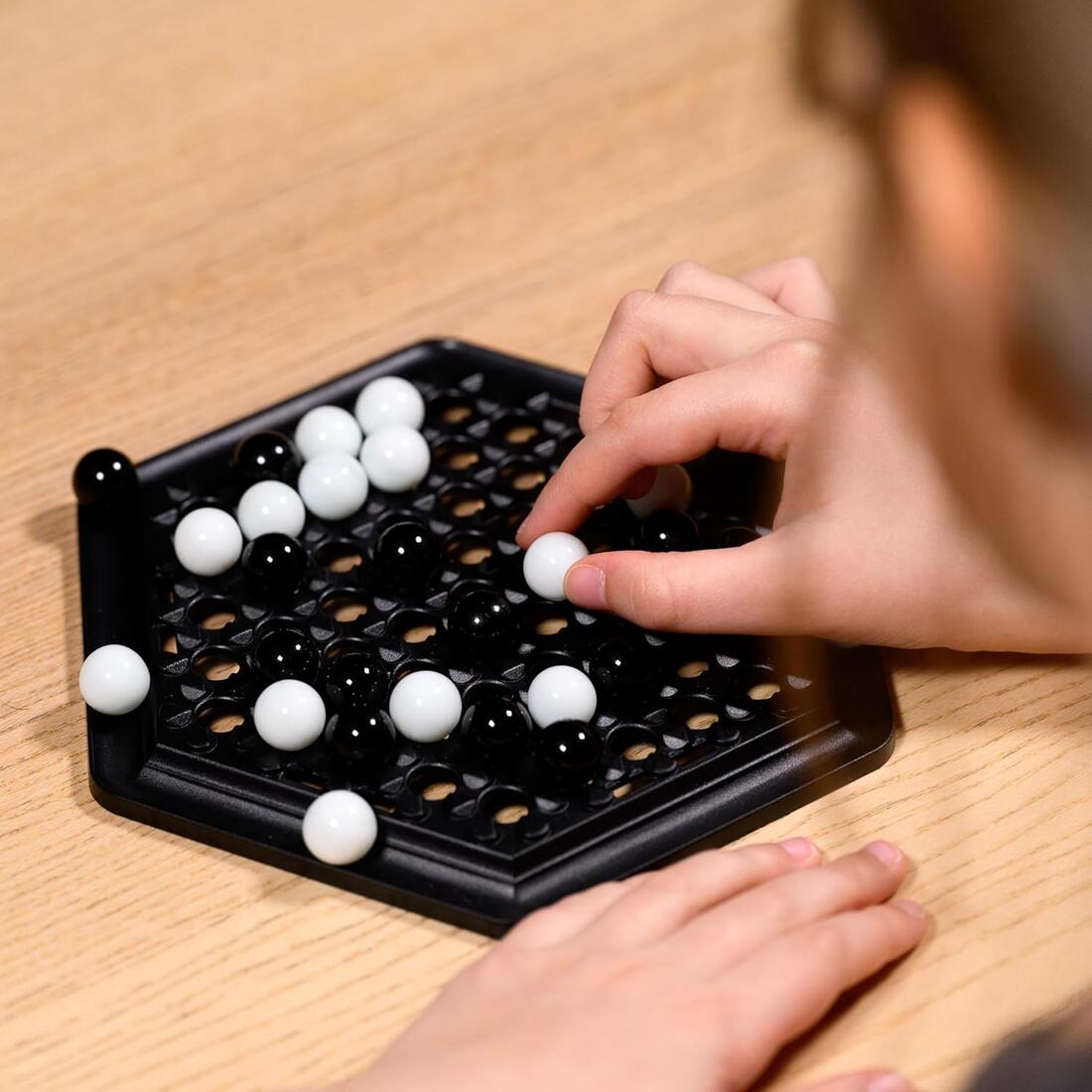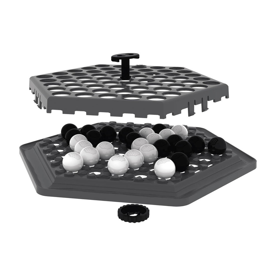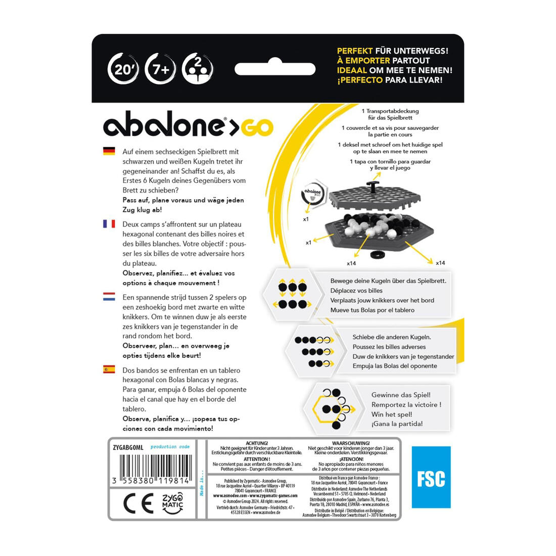 Abalone Go is de praktische reisversie van het abstracte, strategische klassieke spel. Je strijdt tegen elkaar op een zeshoekig bord met zwart-witte ballen. Verplaats je ballen over het bord om deze van je tegenstander te verplaatsen. Kun jij als eerste zes ballen van je tegenstander van het bord duwen?