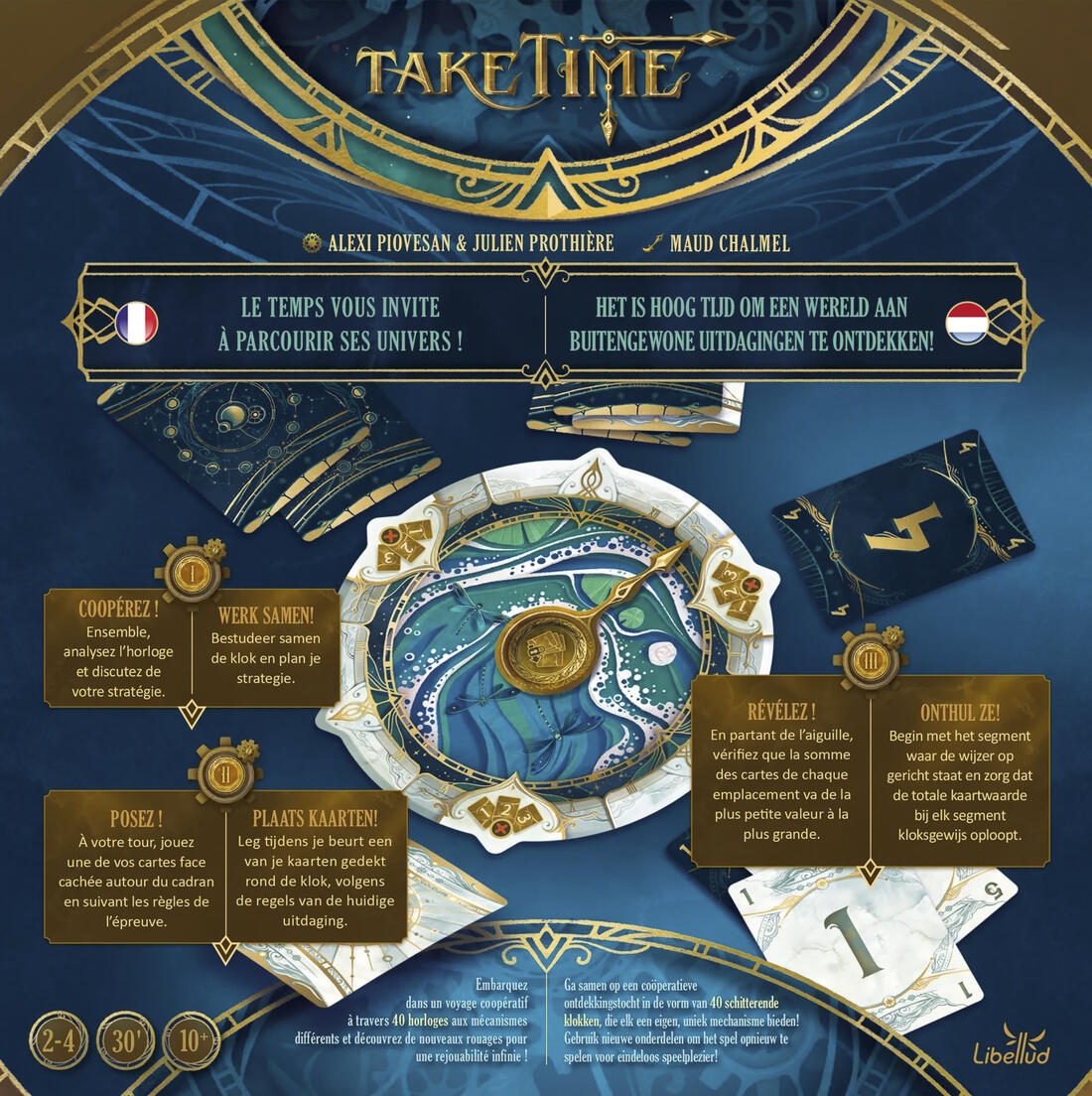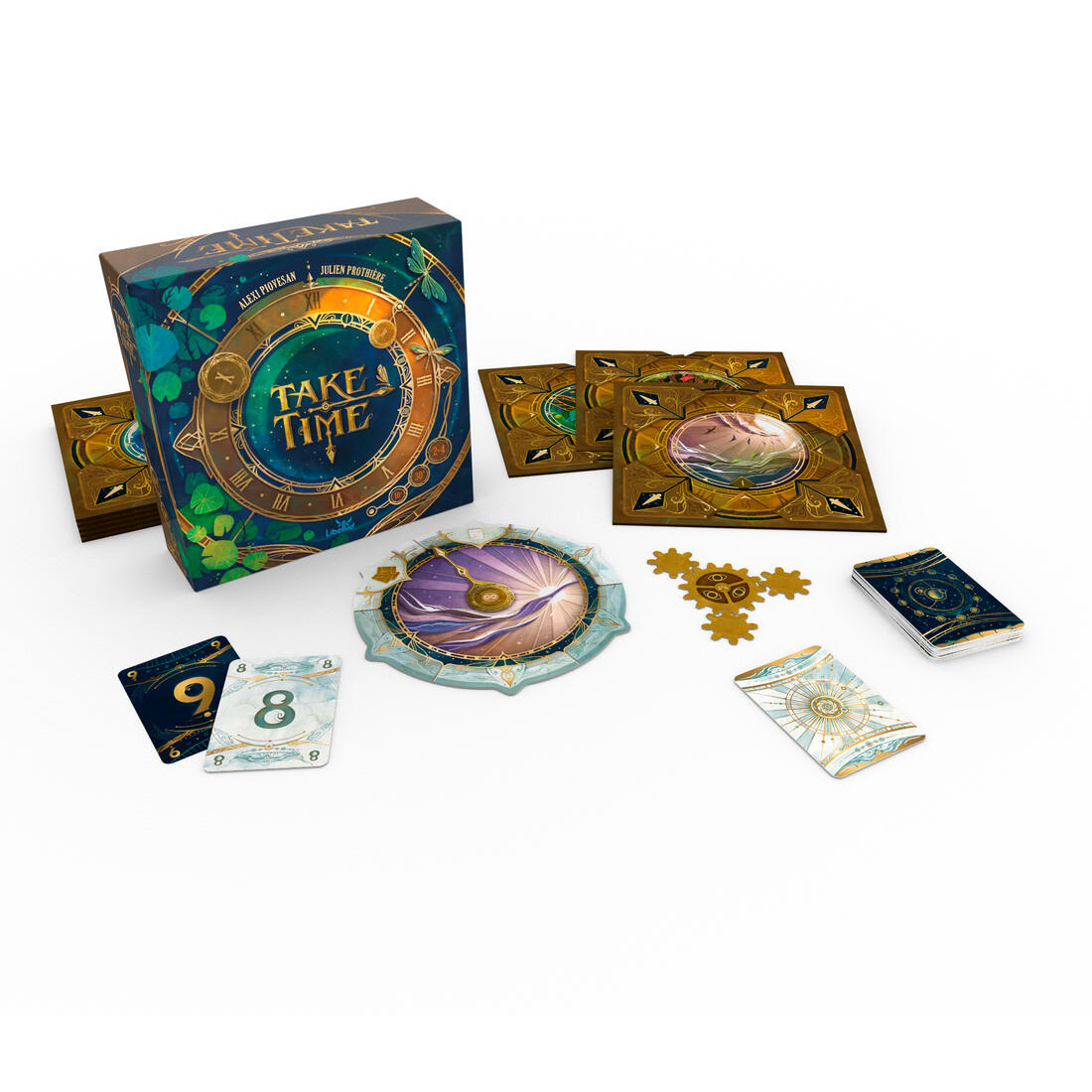 Take Time is een coöperatief deductiespel met beperkte communicatie, waarbij 2 tot 4 spelers samenwerken om mysterieuze klokpuzzels op te lossen door kaarten voorzichtig rond een wijzerplaat te plaatsen.