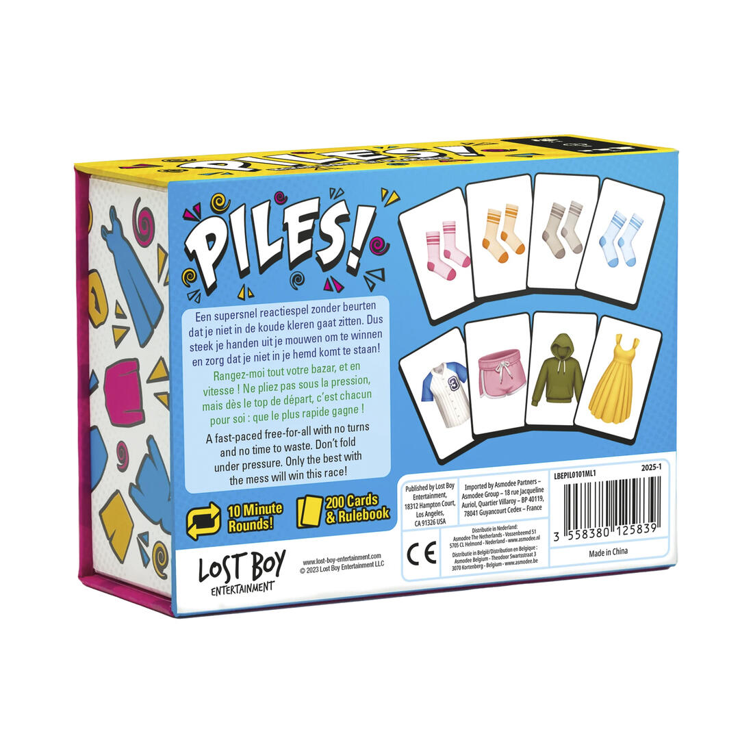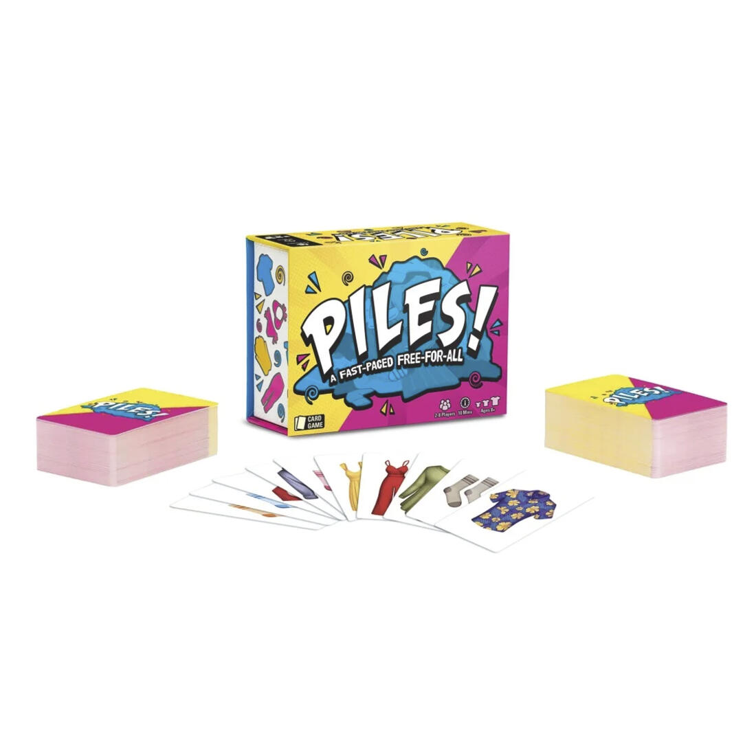 Piles! is een snel verzamelspel voor het hele gezin. Speel met 2 tegen elkaar of speel met 8 tegelijk! Zoek zo snel mogelijk sets kledij bij elkaar door telkens kaarten te ruilen met een universele aflegstapel. In jouw gedekte decks mag je telkens 1 kaart ruilen met de aflegstapel om zo snel mogelijk sets te vormen. Iedereen speelt tegelijk waardoor de aflegstapel in het midden wel erg snel van samenstelling wijzigt!