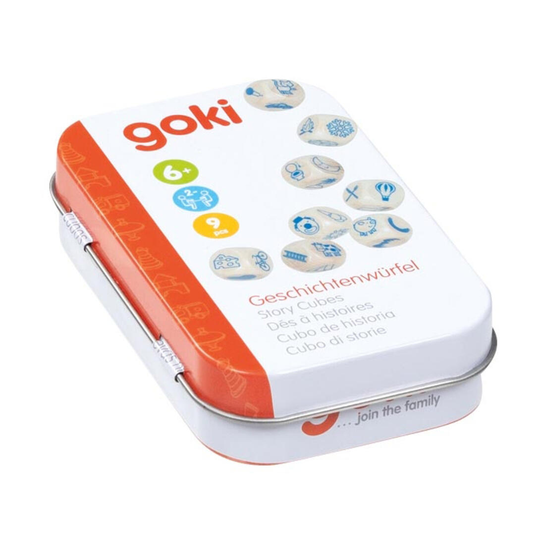 Set van 9 houten verteldobbelstenen in tin 4+