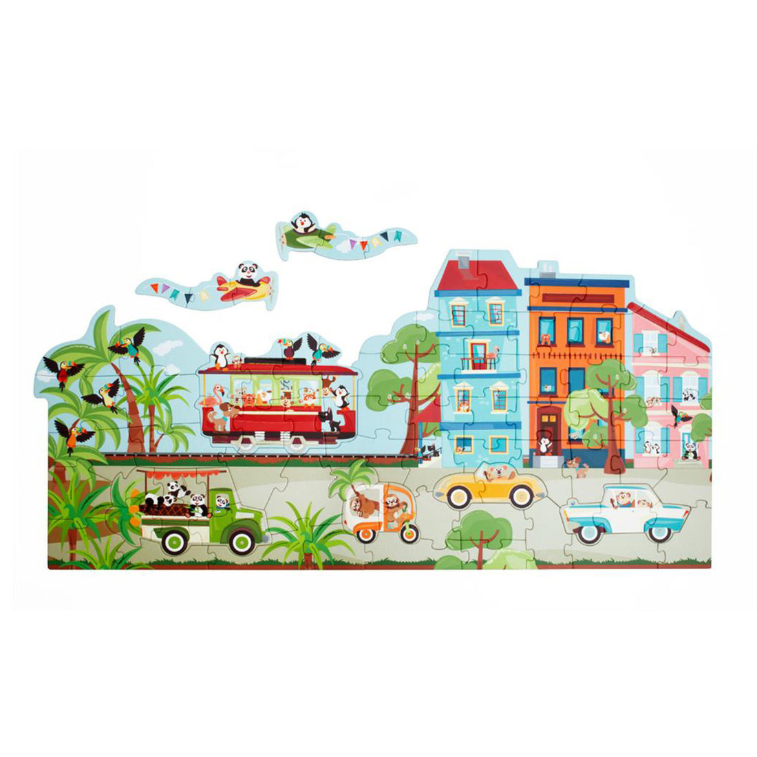 Uiteindelijk passen alle figuren in een grote vloerpuzzel van 80 stuks met een stadszicht.
