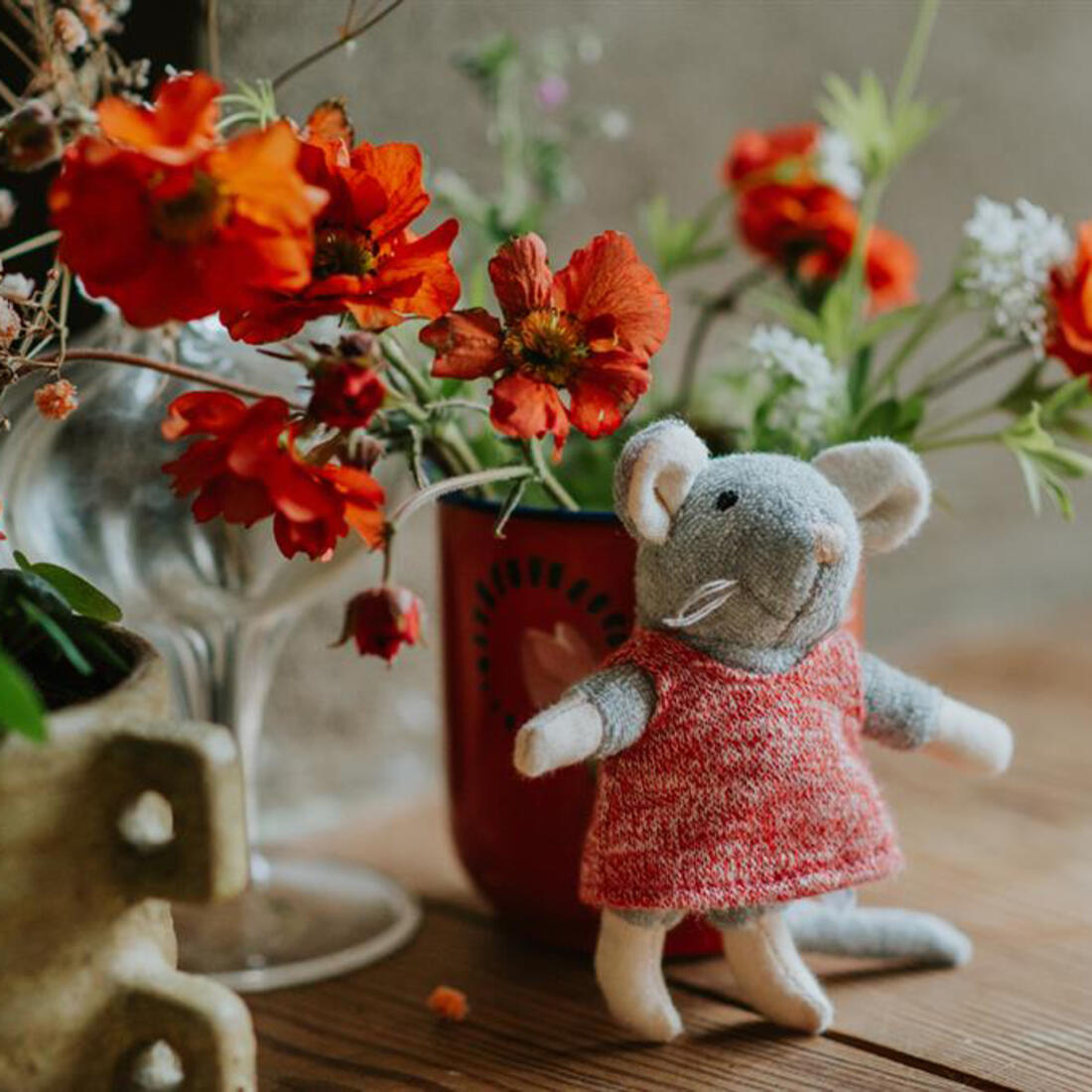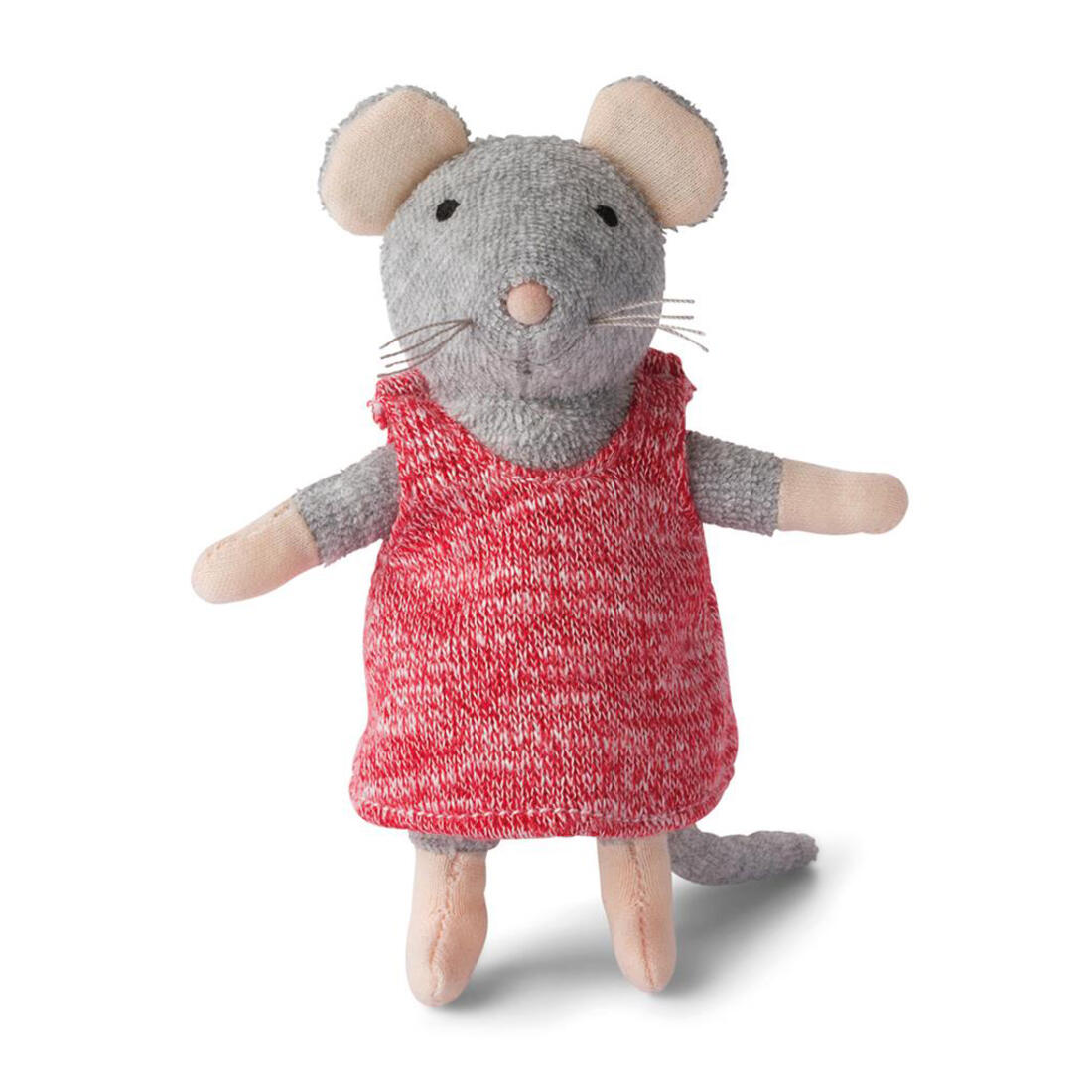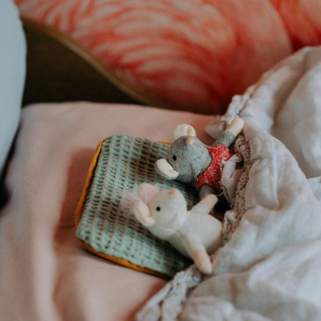 Muisje Julia in pluche past bij de activiteitenkoffertjes met muizenkamertjes.
