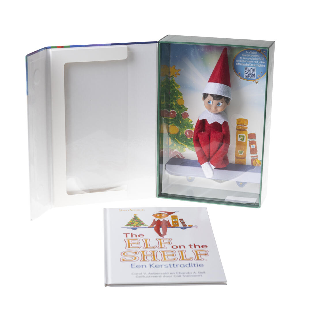 Een giftbox met pop van de kerstelf om spelletjes in huis te spelen zoals verstoppertje. Met een officieel adoptiecertificaat en een geïllustreerd verhalenboek in het Nederlands: 'The Elf on the Shelf: een kersttraditie'.