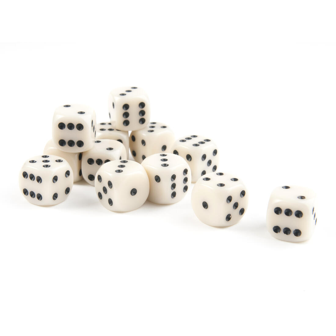 Set van 12 ivoorkleurige dobbelstenen met zwarte stippen, hoogte is 16 mm