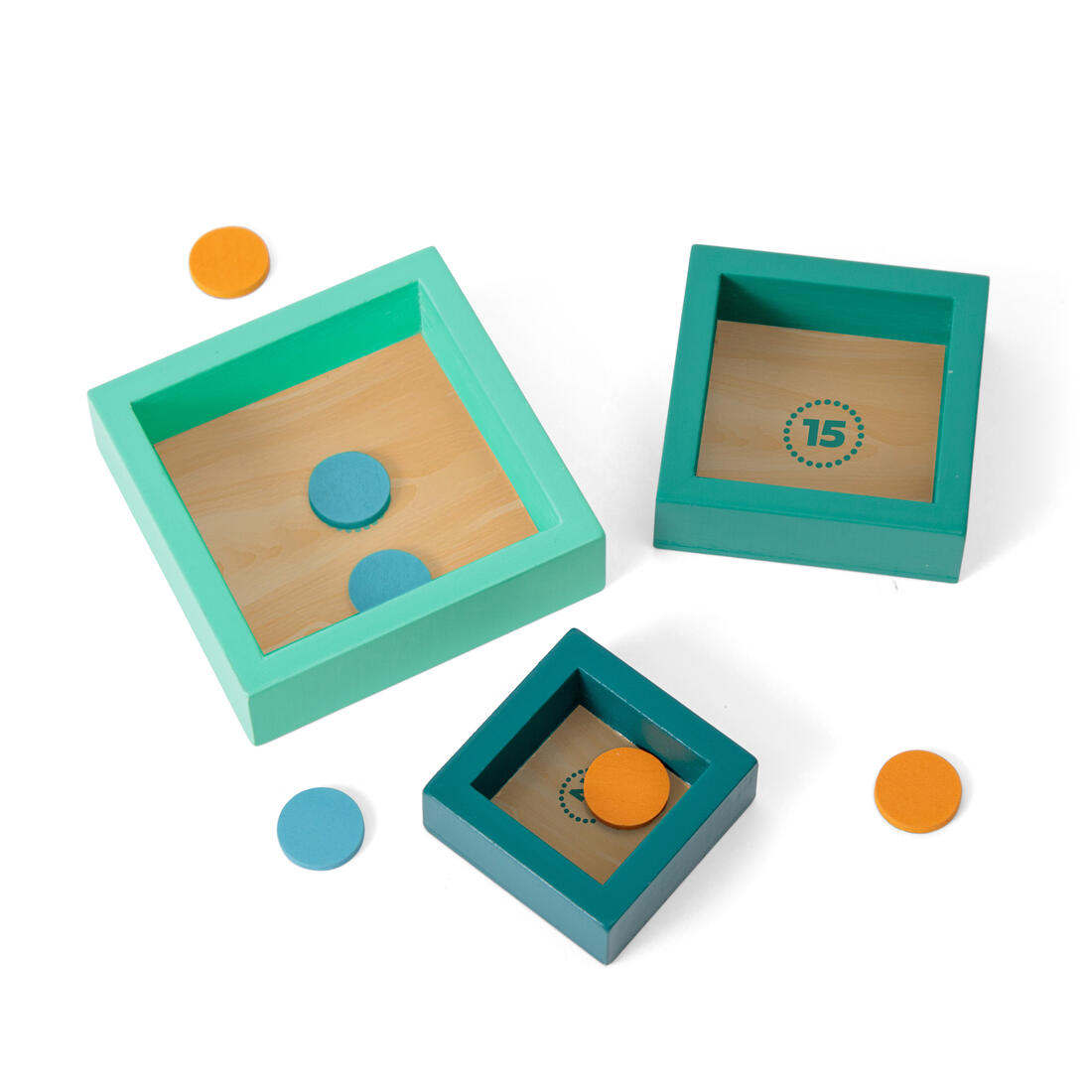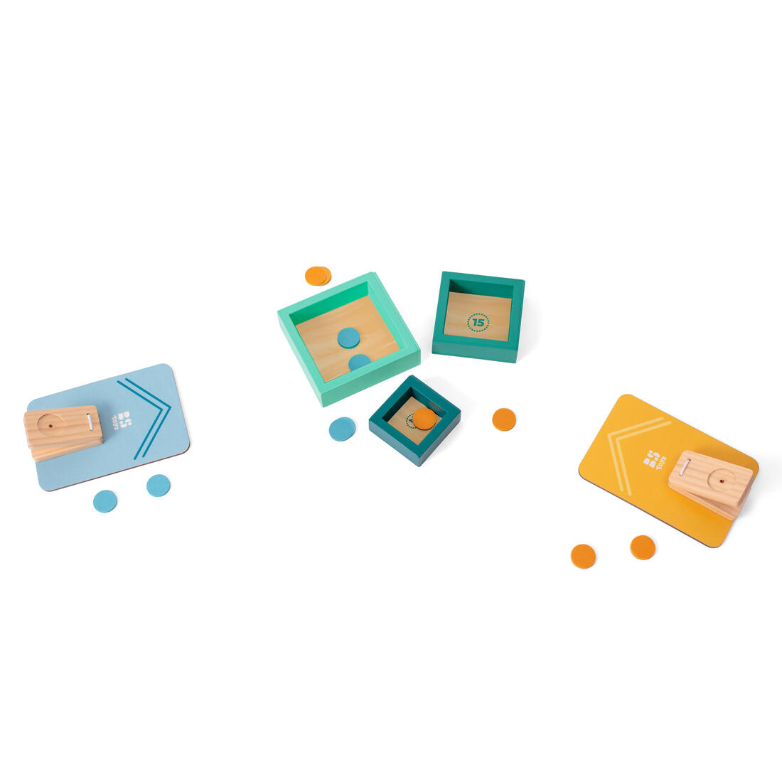 Hout | 3 doelen, afmetingen 9×9 – 7×7 – 5×5 cm | 2 katapulten, 13x9x4 cm | 10 schijven, Ø 2 cm