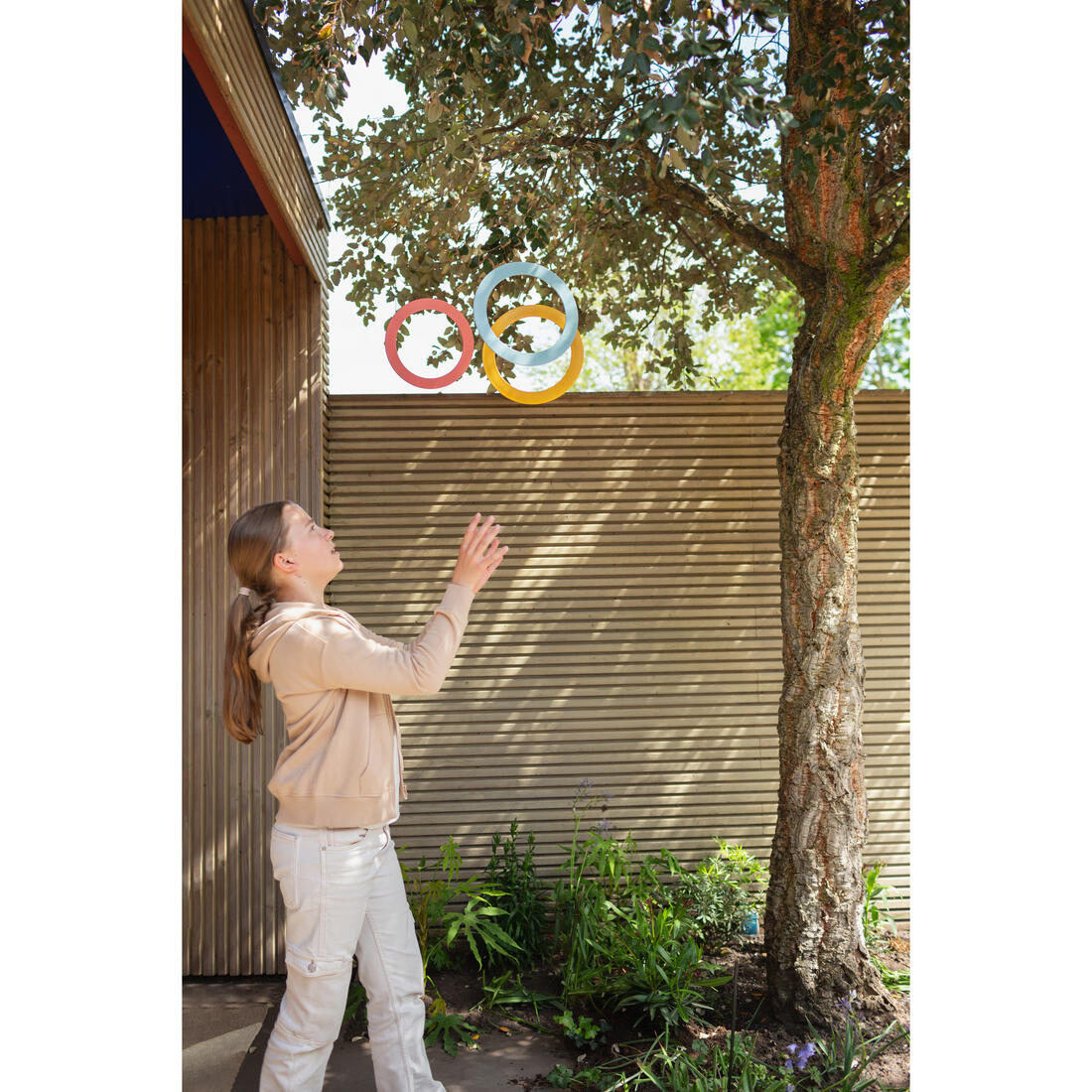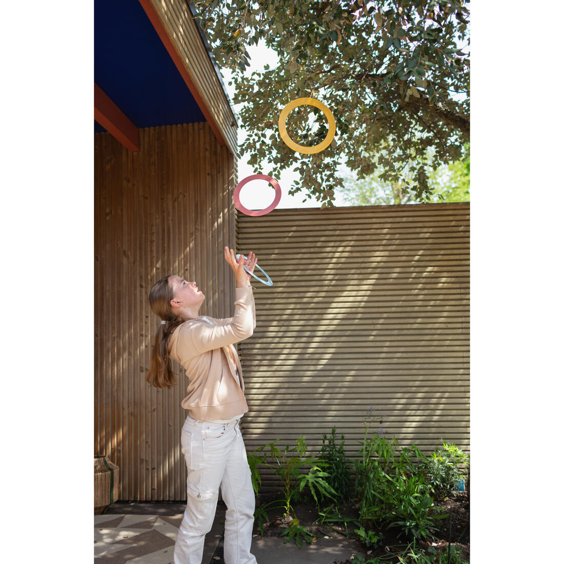 3 mooie jongleerringen uit biomateriaal. De grondstof voor dit ecoproduct is tarwestro. De ringen hebben een diameter van 24 cm en zijn in geel, roze en lichtblauw.