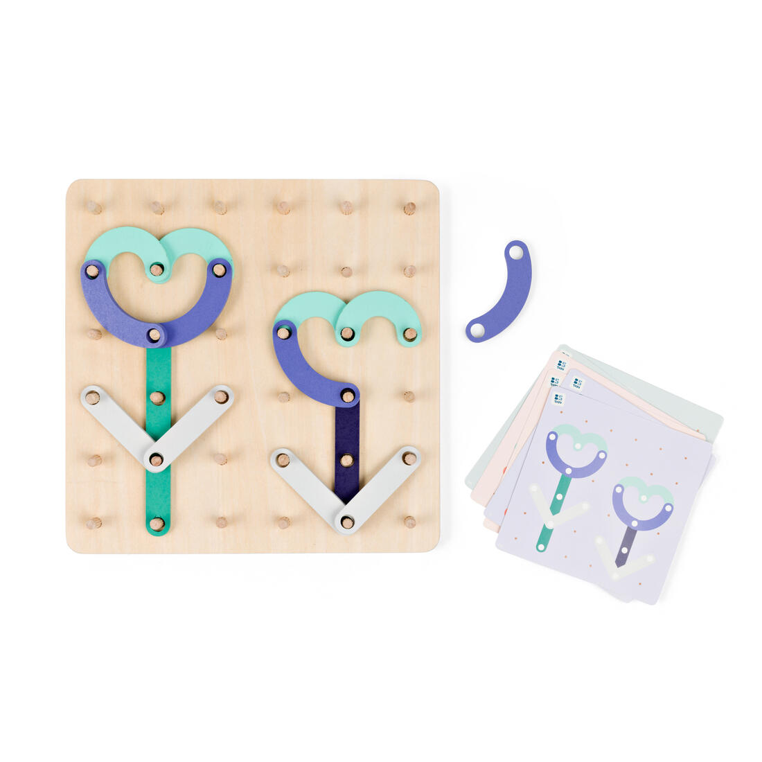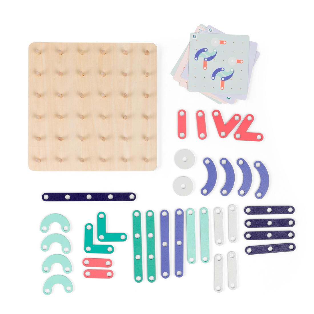 Deze Geoplank bestaat uit een houten bord van 21 op 21cm en 33 houten speelstukken. Bijgevoegd zijn 6 kaarten met samen 12 opdrachten.