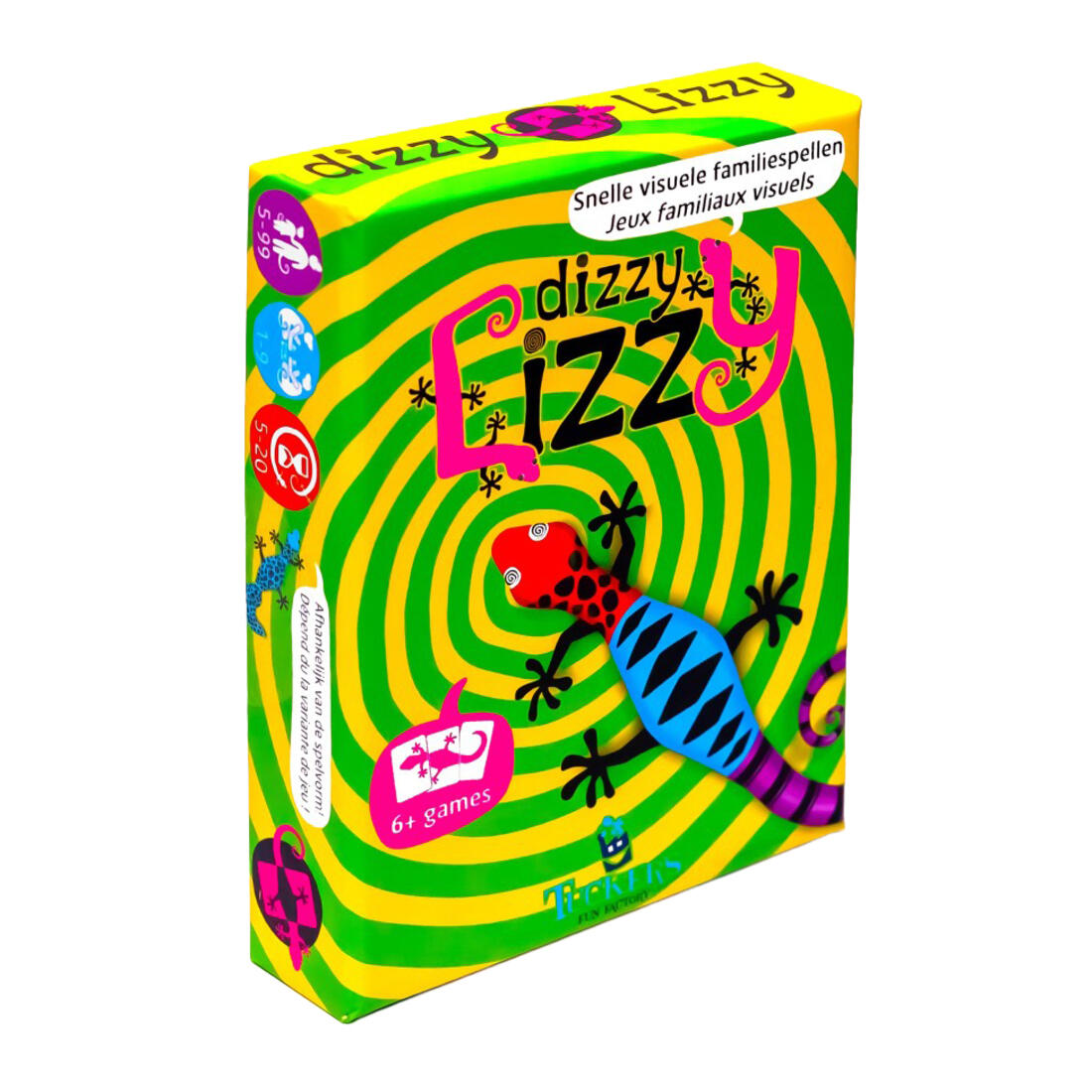 De vrolijke hagedis moet altijd aan tenminste één van de volgende vier voorwaarden voldoen: 1. Alle kleuren zijn hetzelfde 2. Alle kleuren zijn anders 3. Alle patronen zijn hetzelfde 4. Alle patronen zijn anders Eén veranderende Lizzy; drie kleuren en drie patronen, alles wat er nodig is voor duizelingwekkend speelplezier! Dit doosje bevat 6 spelvormen en meer. Speel competitief, samen of solo.