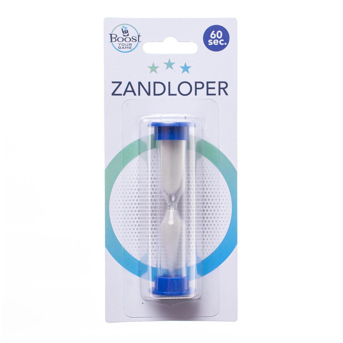 Blauwe zandloper 'Boost your game' met doorlooptijd van 60 seconden of een minuut.