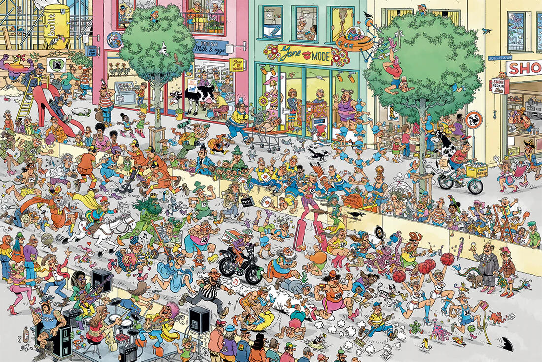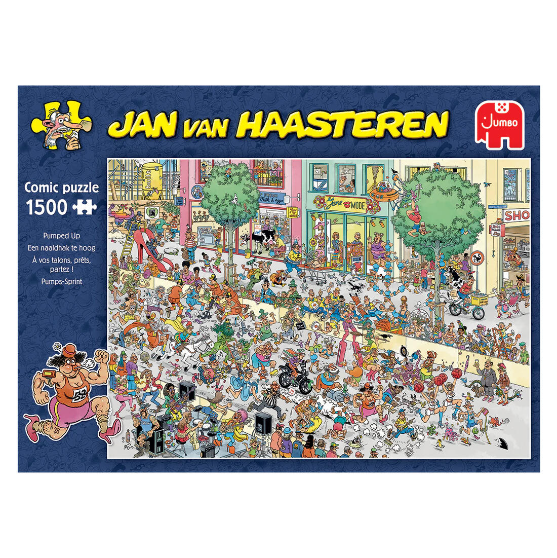 Ter gelegenheid van de opening van een splinternieuw winkelcentrum wordt een stiletto – run georganiseerd. Uiteraard is de Jan van Haasteren – familie van de partij! Tot grote verbazing van iedereen blijkt Jan zelf een ervaren hardloper op hoge hakken. Aangemoedigd door twee enthousiaste cheerleaders voert hij de race aan. Op zijn hielen zit schoonmoeder, die zich door niets of niemand laat tegenhouden. Sinterklaas huppelt vrolijk mee, de heks speelt schaamteloos vals en zelfs de hopman heeft zijn stevige wandelschoenen ingeruild voor een paar pumps, tot grote hilariteit van zijn welpen. Een Jan van Haasteren puzzel is meer dan een gewone legpuzzel: het is een avonturenserie, met vertrouwde hoofdrolspelers in een eindeloos decor vol absurde details. Ontdek alle doldwaze avonturen van de Jan van Haasteren – familie! We zijn trots dat onze puzzels zijn gemaakt van gerecycled karton in Europa. Om het karton in puzzelstukjes te snijden, gebruikt men het dunste mes dat er is. De puzzel ziet er bijna naadloos uit als hij klaar is. Geniet van deze Jan van Haasteren – puzzel!