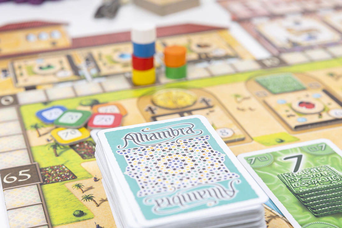 In Alhambra bouw je de gebouwen in je eigen speelgebied door Alhambrategels te kopen en deze voor je neer te leggen. Op deze manier bouw je je eigen Alhambra. In het spel zijn er 2 puntentellingen die door de gedekte trekstapel onverwachts geactiveerd worden. De speler met de meeste gebouwen van een type ontvangt hiervoor punten. Voor elk type gebouw ontvang je tijdens de puntentellingen punten. Het aantal punten dat je voor een type gebouw ontvangt, zie je op de overeenkomende scorestrook op het scorebord. Door goed vooruit te plannen en het scorebord in de gaten te houden, kun je veel punten ontvangen. Daarnaast ontvangt elke speler tijdens elke puntentelling punten voor zijn langste onafgebroken muur. Aan het einde van het spel ontvangt elke speler ook punten voor de bewakers op zijn langste onafgebroken muur. De speler die aan het einde van het spel de meeste punten heeft verzameld, is de winnaar!