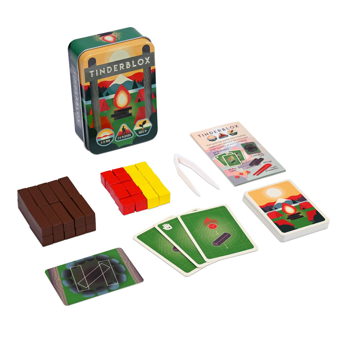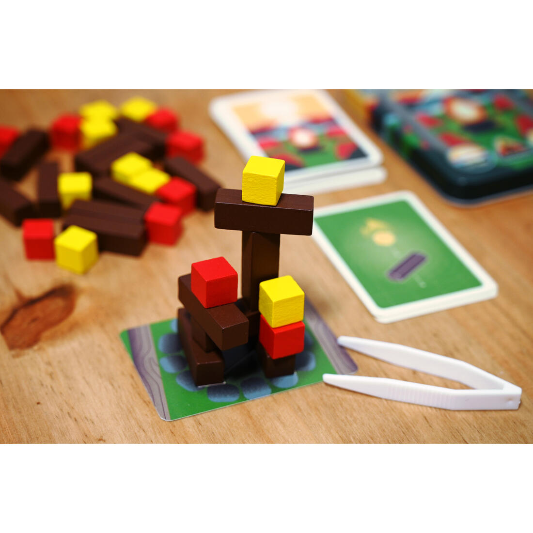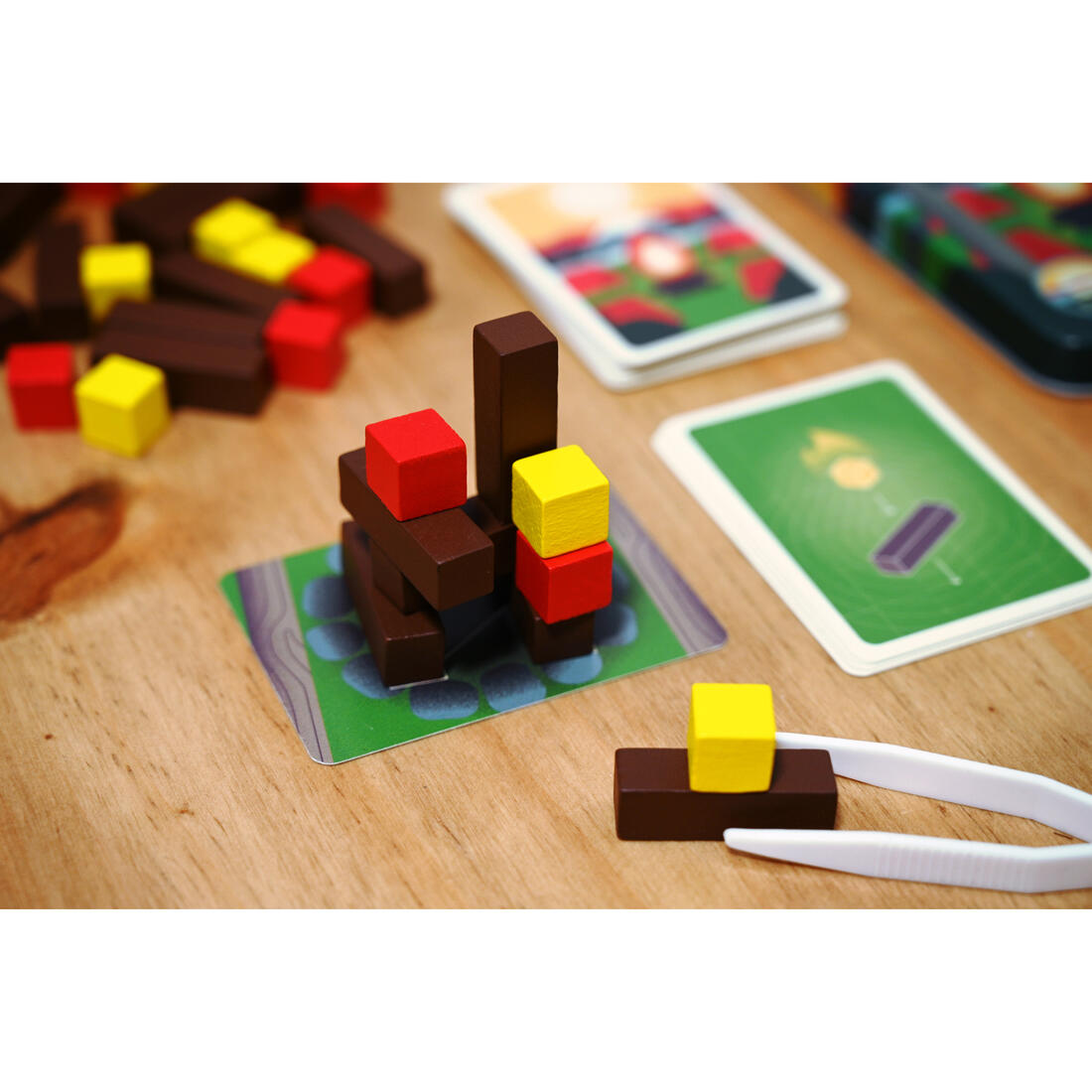 Draai een kaart om, pak hout- en vuurblokken met de tang, bouw het kampvuur, maar laat niets omvallen!