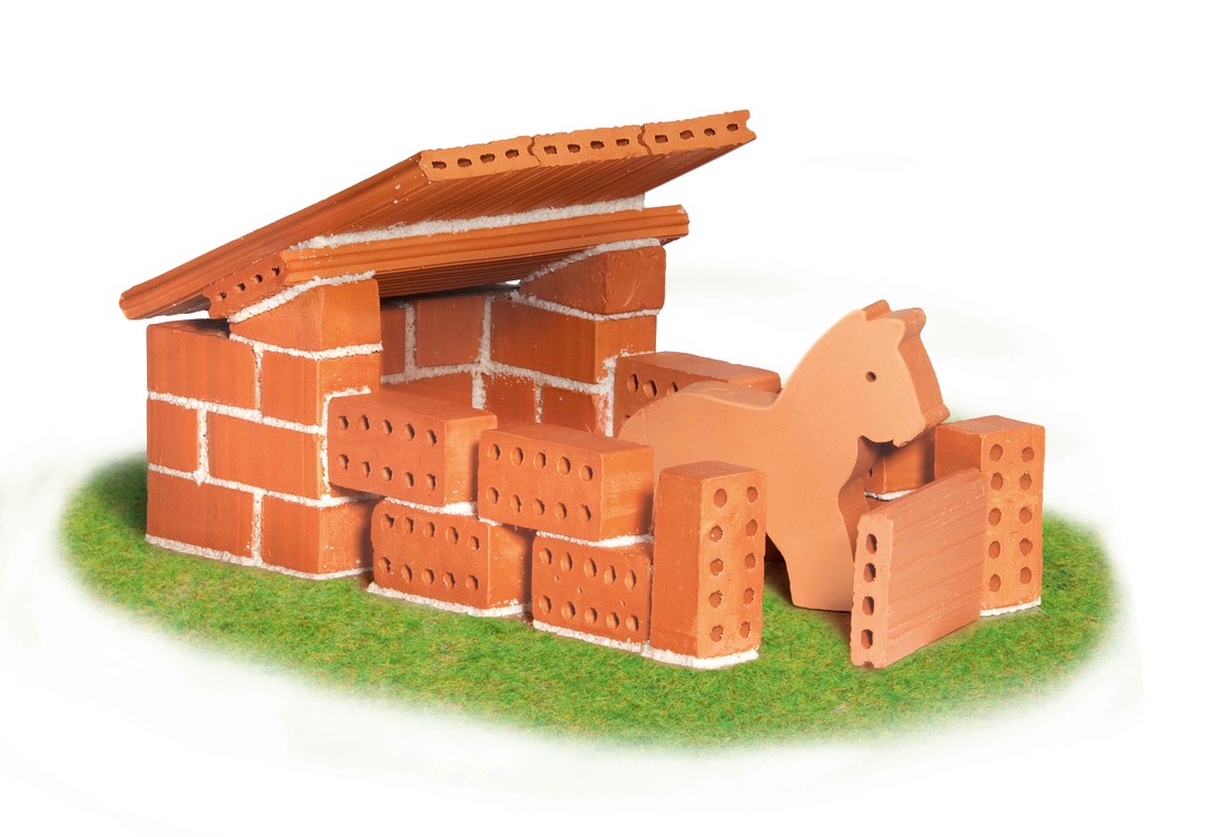 Bouwen met echte baksteentjes! De mortel bestaat uit fijn zand en maïs. De mortel is oplosbaar in water. De steentjes zijn herbruikbaar. Je mag dus je fantasie gebruiken!