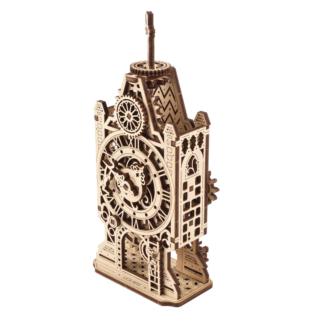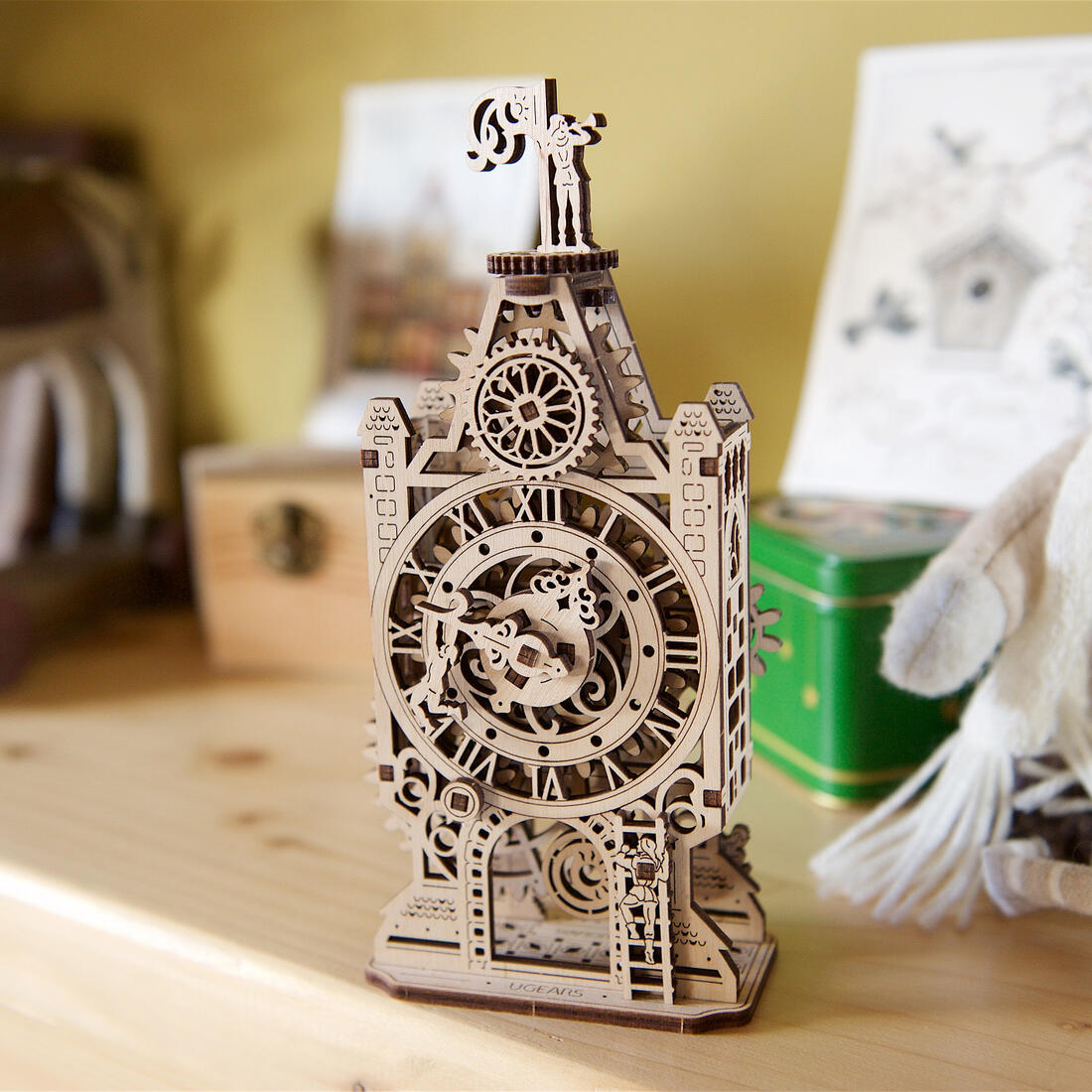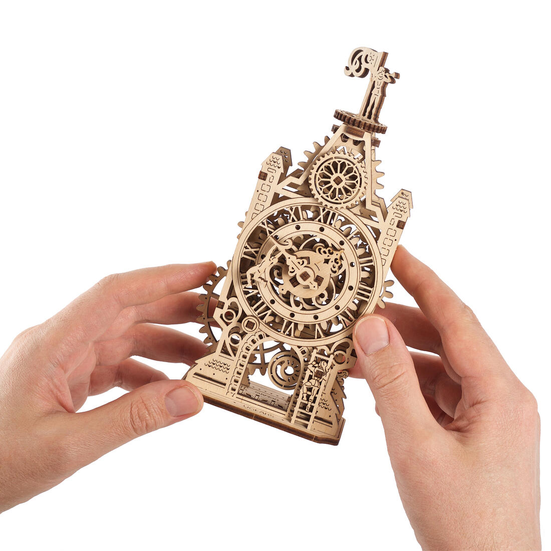 Het mini-model van de oude klokkentoren van Ugears creëert een betoverende middeleeuwse ambiance in elke woon- of werkruimte. Dit prachtige doe-het-zelf houten model van een klokkentoren is een kinetisch kunstwerk, bestaande uit een toren met een klok, tandwielen, een pendule, eigenzinnige figuren en een windvaan. Door aan het grote tandwiel te draaien, komen de klok, de pendule en de windvaan tot leven.