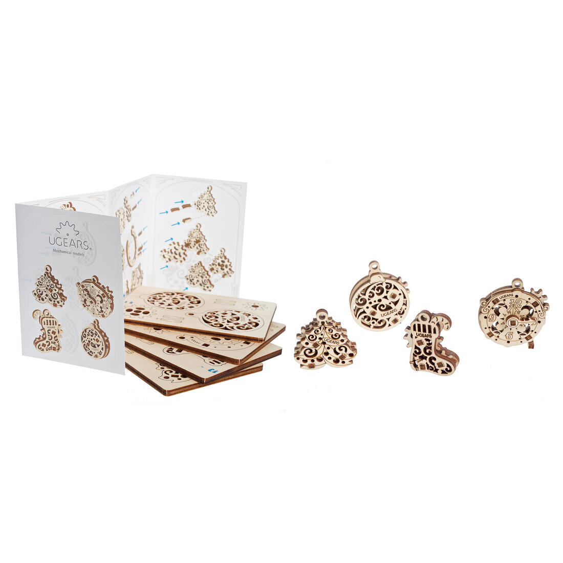 Versier je kerstboom feestelijk, nadat je deze kleine modellen hebt gebouwd. Deze set bestaat uit een miniatuur kerstbal, klok, kerstboom en sok. Natuurlijk met bewegende radertjes.