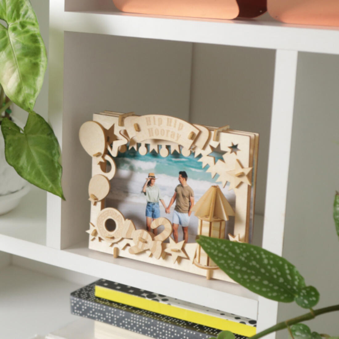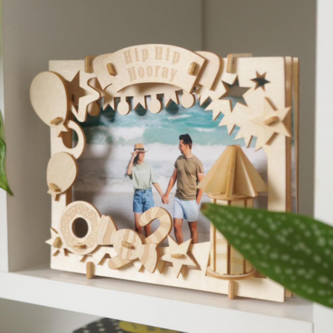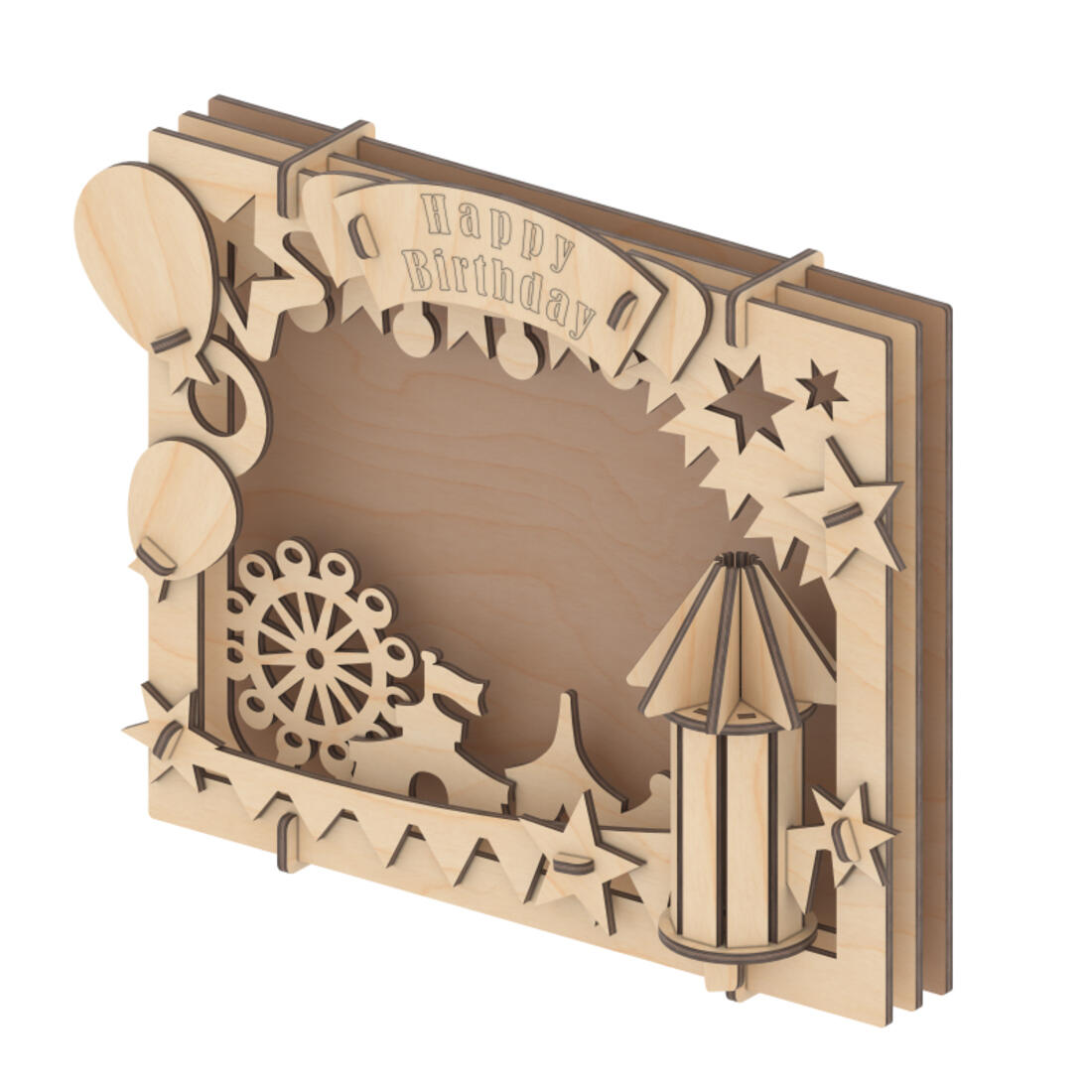 Je kunt de kaart dus ongemonteerd in de enveloppe steken en gebruiken, of je kan vooraf de fotokader of de figuur in elkaar steken. Je hebt hiervoor geen lijm nodig.