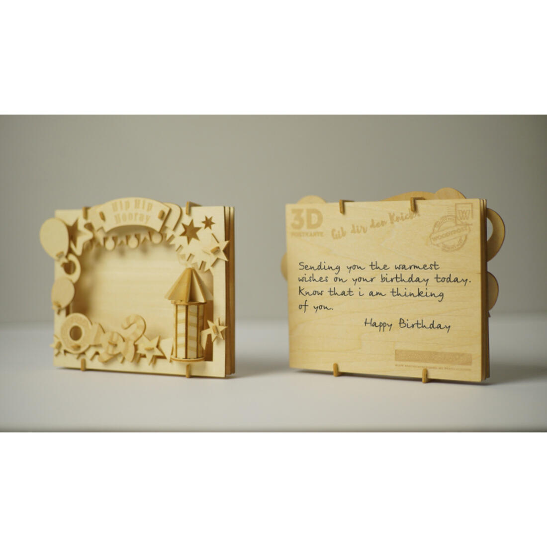 De wenskaarten van Woodypost hebben het formaat van een gewone postkaart. In de verpakking zitten instructies en een omslag.
