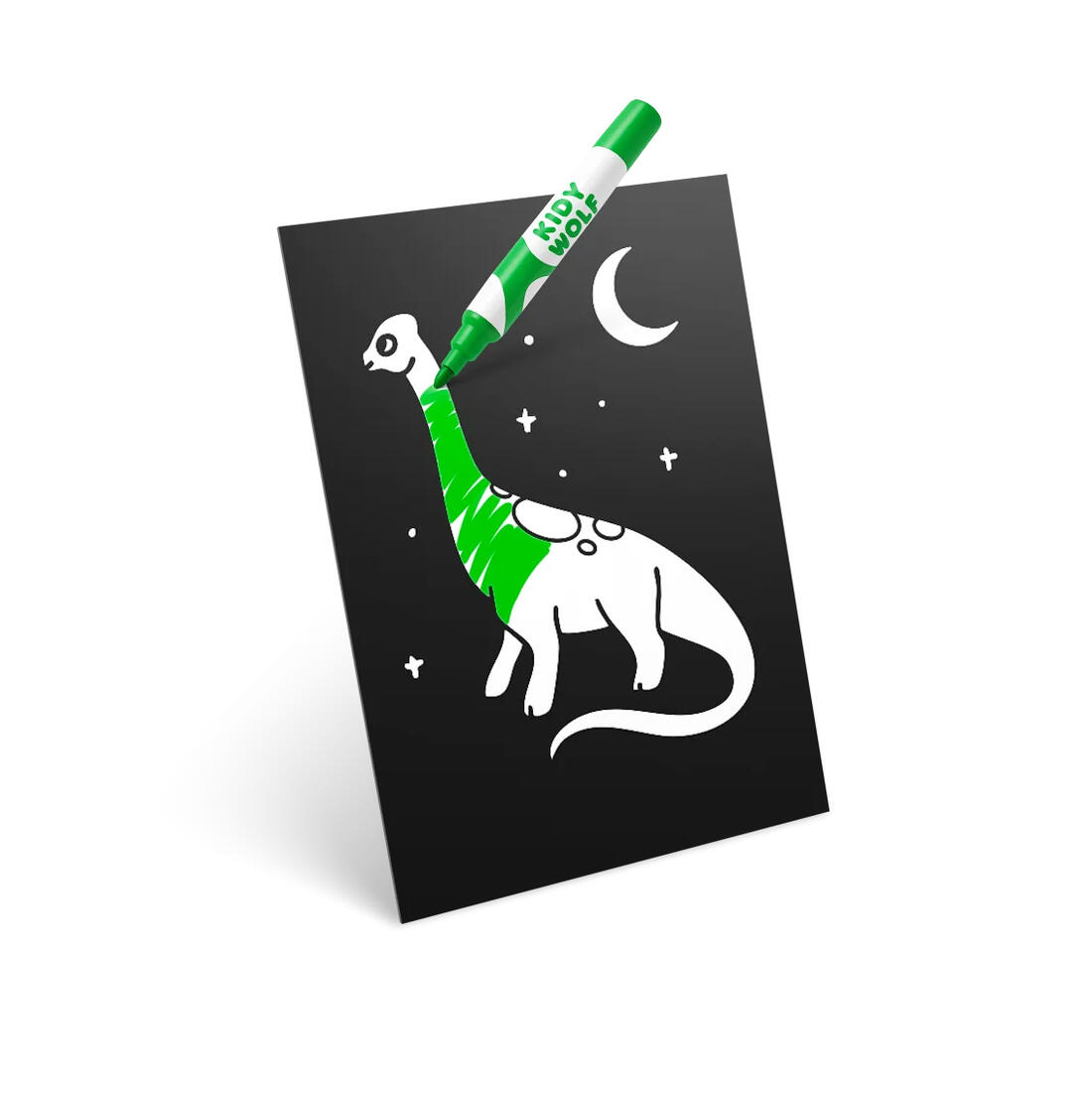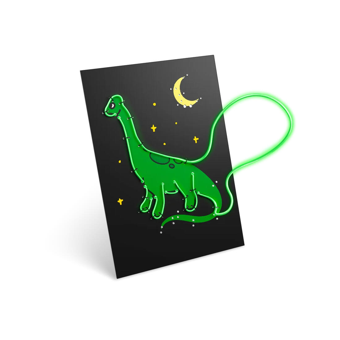 Breng de dinosauriërswereld tot leven met deze Kidyneon kit! Door de afbeeldingen in te kleuren en de groene LED-lichtdraad te bevestigen, maken kinderen een indrukwekkende dinowanddecoratie.