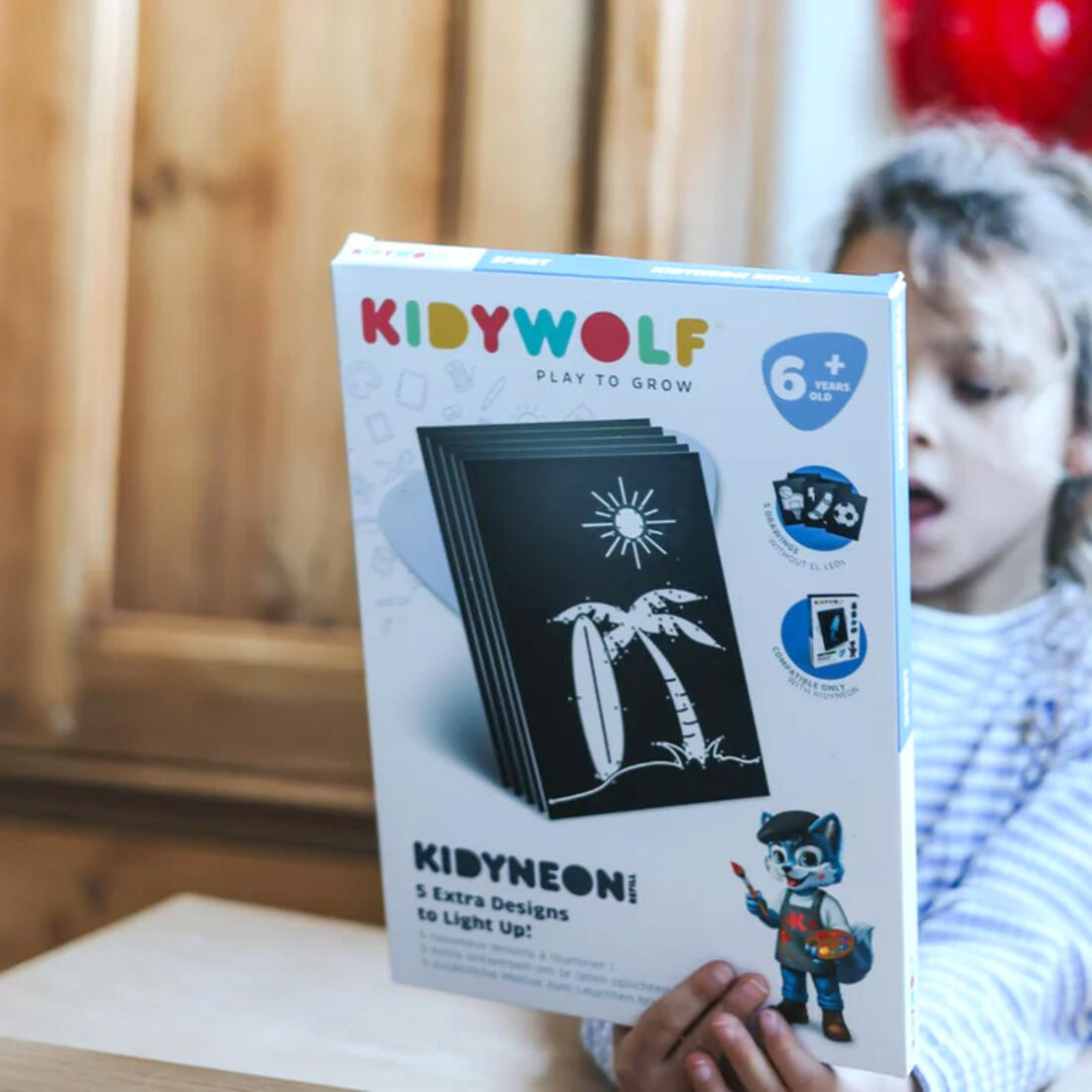 Met de Kidywolf Kidyneon Light-up Wall Art Craft Kits kunnen kinderen hun eigen kleurrijke muurkunst creëren die ook nog eens oplicht. Dit aanvulpakket bevat enkel drie leuke illustraties in een bepaald thema, die je naar eigen smaak kunt inkleuren. Het speciale neon LED-lichtsnoer wordt NIET meegeleverd. Deze creatieve set in het thema "Happy" kan enkel gebruikt worden in combinatie met een Kidyneon Craft Kit.