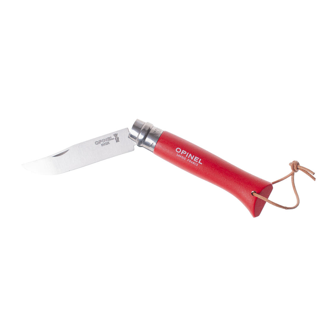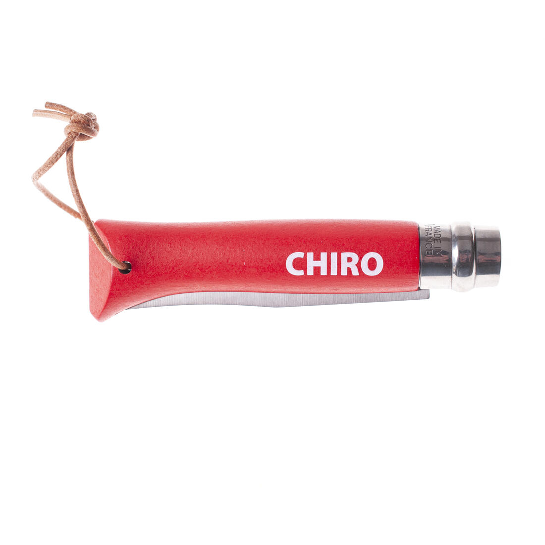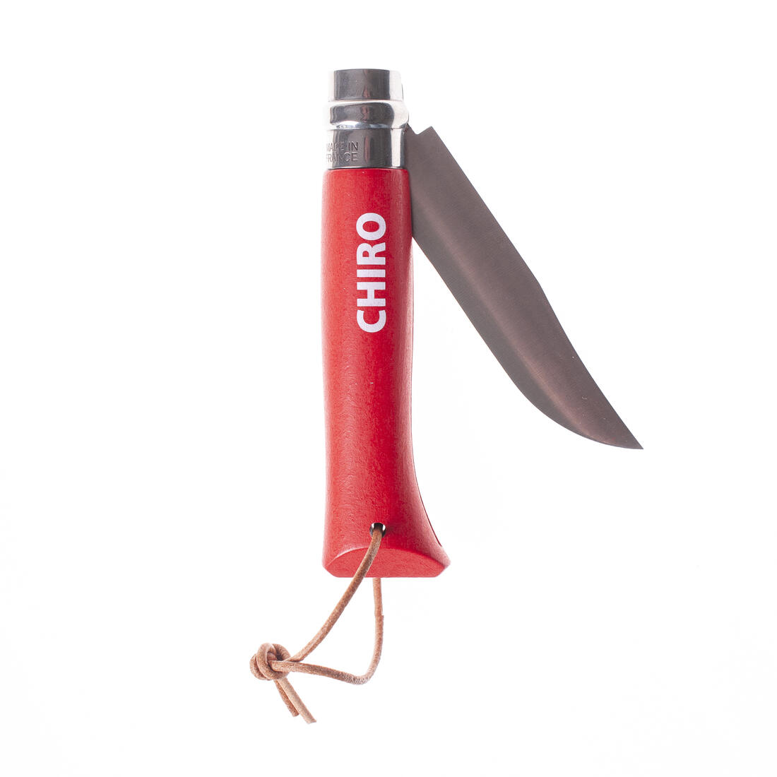 Het avonturenmes van Opinel met een lemmet in inox (roestvrijstaal) en een handvat in rood met Chiro-opdruk. Met gepatenteerd virobloc-systeem.