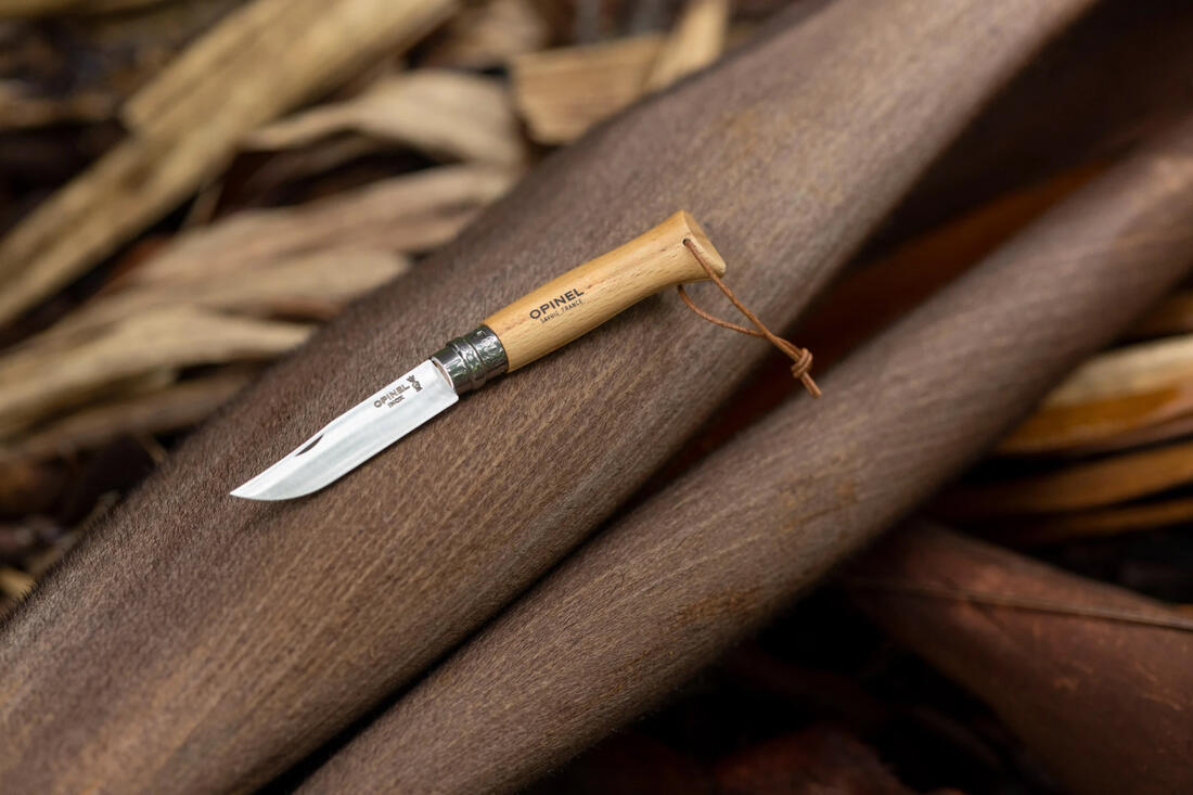 Het avonturenmes van Opinel met een lemmet in inox (roestvrijstaal) en een handvat in beuk. Met gepatenteerd virobloc-systeem.